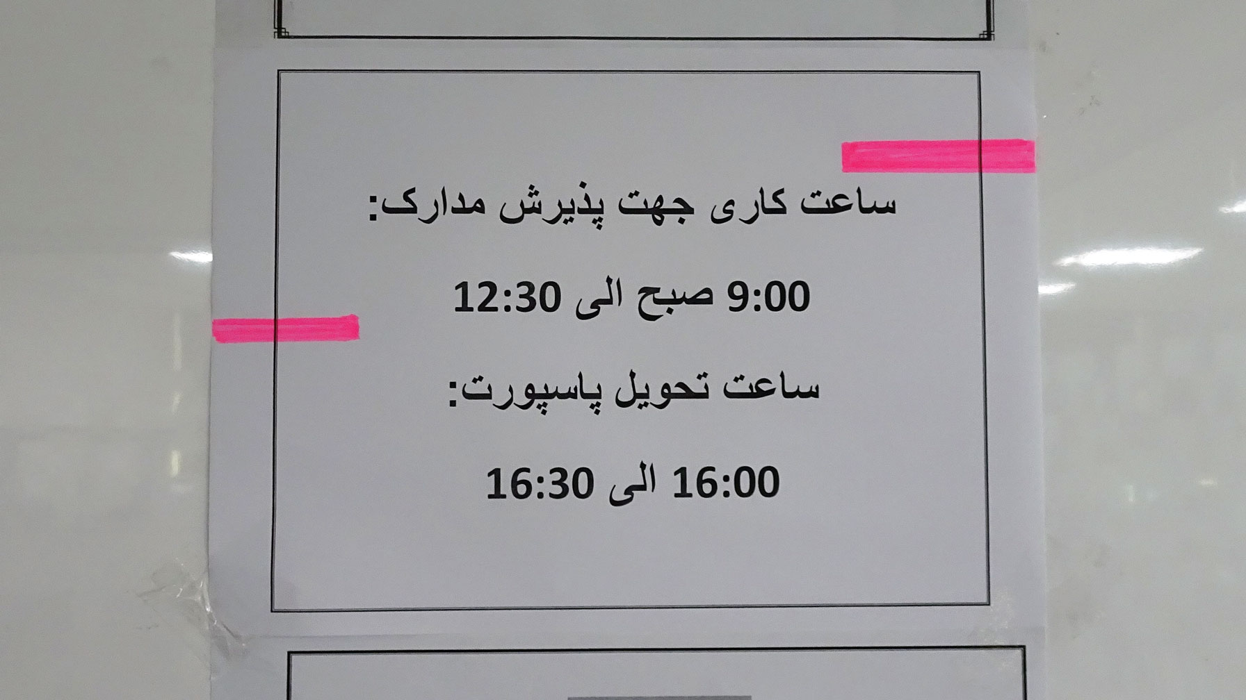 Ils sont trois à s’occuper de nous lorsque tout à coup, Euréka ! Quelqu’un vient finalement de comprendre notre problème ! Ni une, ni deux, on nous renvoie au centre des visas... et on explique à la secrétaire, en perse cette fois, que nous n’avons pas d’autres choix que de faire la demande par écrit. Alléluia ! Après une heure et demi d’attente, on nous écoute enfin !