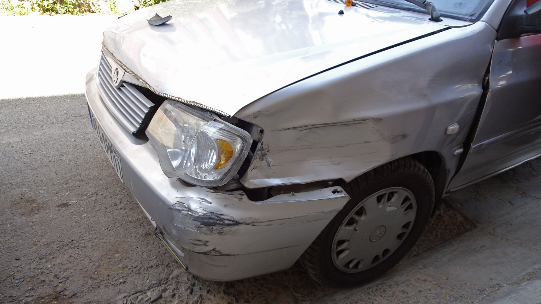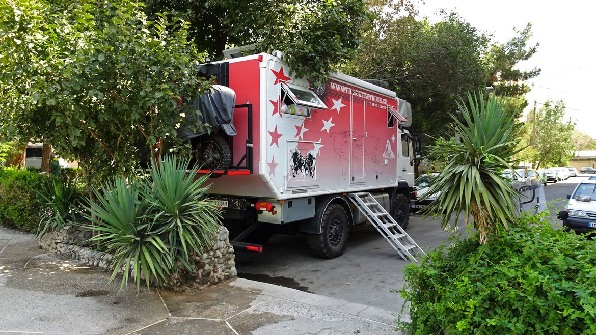 Dans le chaos « made in Iran », il n’aura fallu qu’une traversée de ville pour comptabiliser notre premier accident. Alors que nous nous apprêtons à tourner dans la rue Aghaghia, une voiture parquée en double fil nous bloque la route. Nous la contournons et braquons à droite. C’est à cet instant, que le conducteur démarre et boum ! Antares ne souffre que d’une égratignure mais le parechoc de la voiture n’a pas supporter le contact des dix tonnes. Il a sale mine…