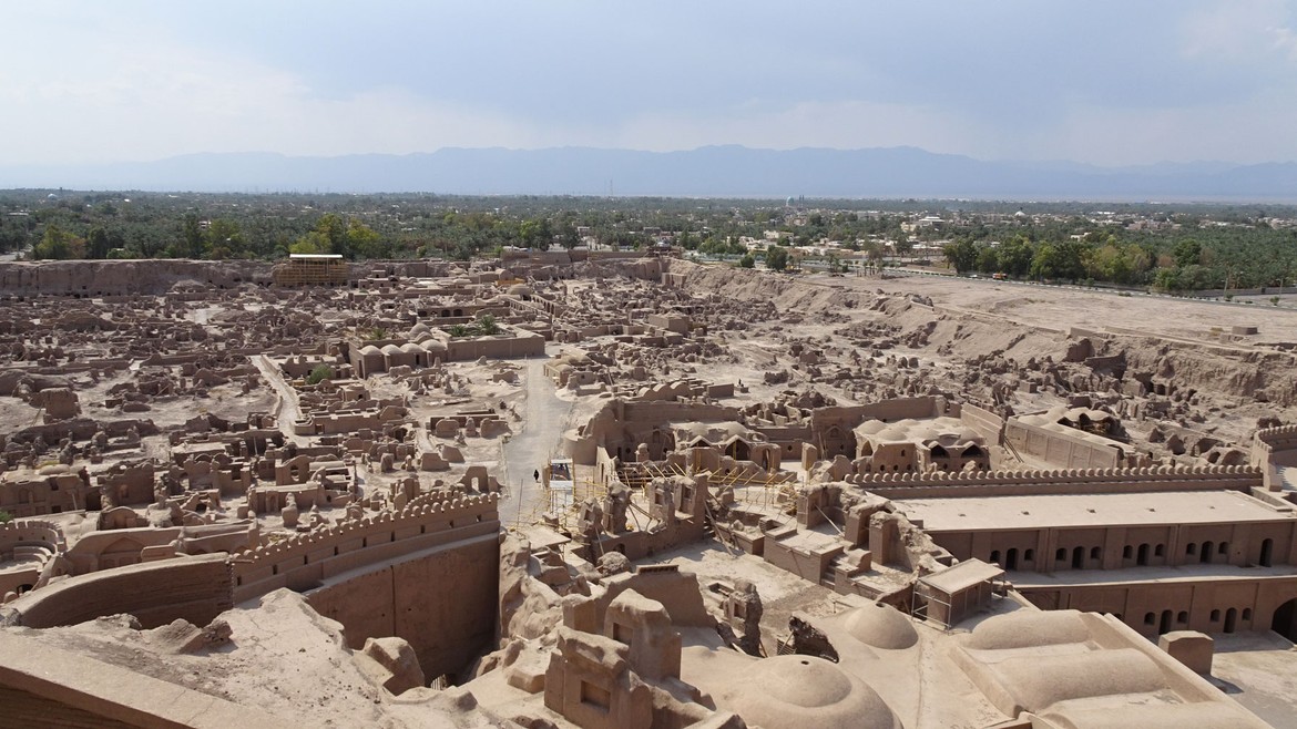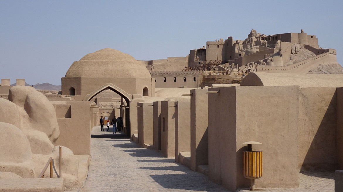 Avant de reprendre la route, nous procédons à notre dernière visite d'Iran : l'Argh-e Bam. Cette ville-citadelle, qui s'étend sur 180'000 m2, date du 5e siècle av. JC et fut détruite lors du séisme de 2003. C'était le plus grand ensemble construit en adobe du monde : argile, mélangée à de l'eau et de la paille, façonnée en briques et séchée au soleil. Elle fut habitée jusqu'en 1850. 80% de la ville s'est effondrée lors du tremblement de terre. Un plan de sauvetage est en cours et une partie des bâtiments a déjà été reconstruite, dont la citadelle.