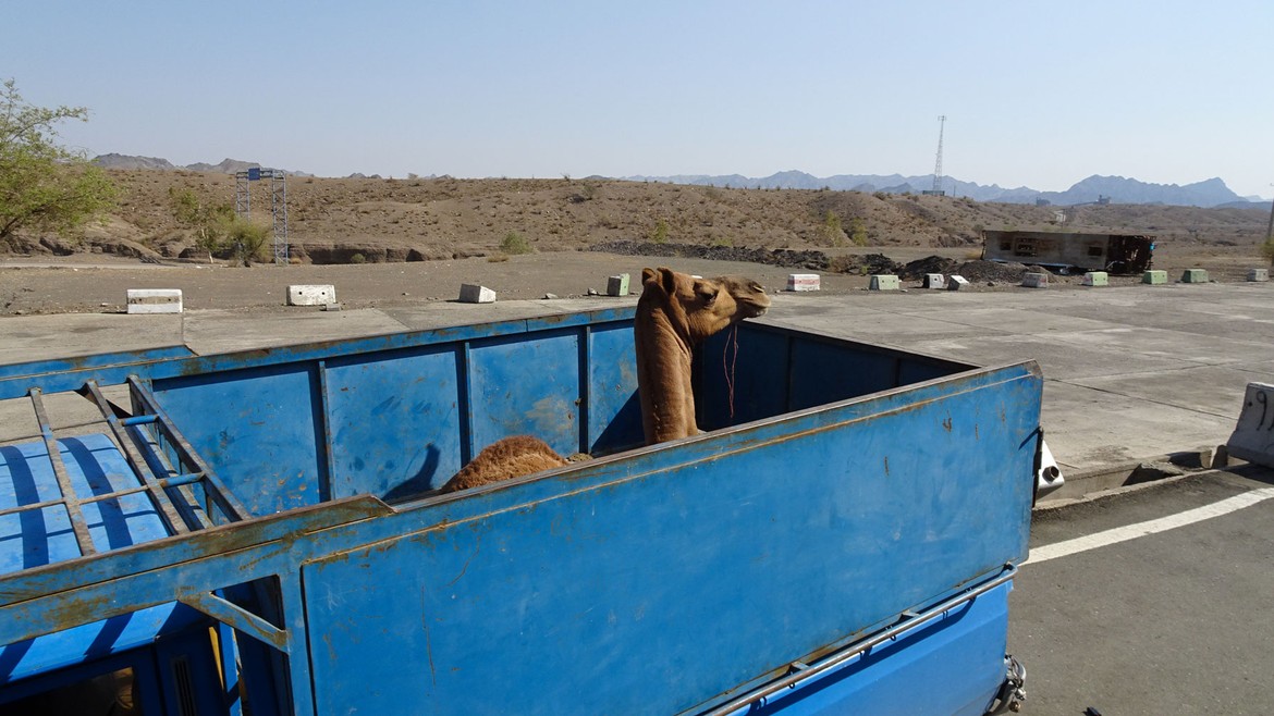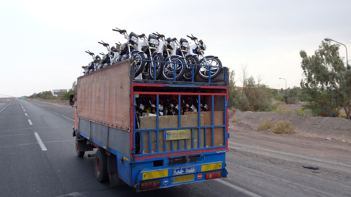 Il y a aussi beaucoup à dire sur la conduite iranienne. En fait, il n'y en a pas. Lors de l'examen, on ne leur apprend qu'à manœuvrer. Personne ne connaît ni le code de la route, ni les priorités, ni les présélections, ce qui nous a amené à deux accidents stupides où les conducteurs se sont littéralement jetés sous les roues du camion. La route est truffée de gendarmes couchés, attention, pas de légers dos d'âne, mais des espèces de butes énormes qui nous forcent à l'arrêt à chaque instant, c'est usant. Quant au carburant, c'est du bonheur total de faire son plein pour moins de dix centimes par litre à la seule condition de trouver une station qui accepte de le faire ! Et oui, au pays du pétrole il faut une carte pour mettre son diesel, carte que nous ne possédons pas car nous sommes touristes... C'est donc au bon vouloir du pompiste, ou selon la générosité des autres chauffeurs qui nous permettent d'utiliser leur carte, que nous faisons péniblement des pleins de 20 à 80 litres.