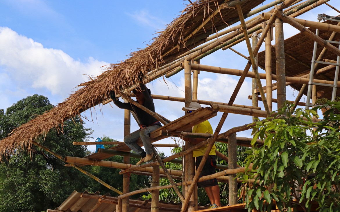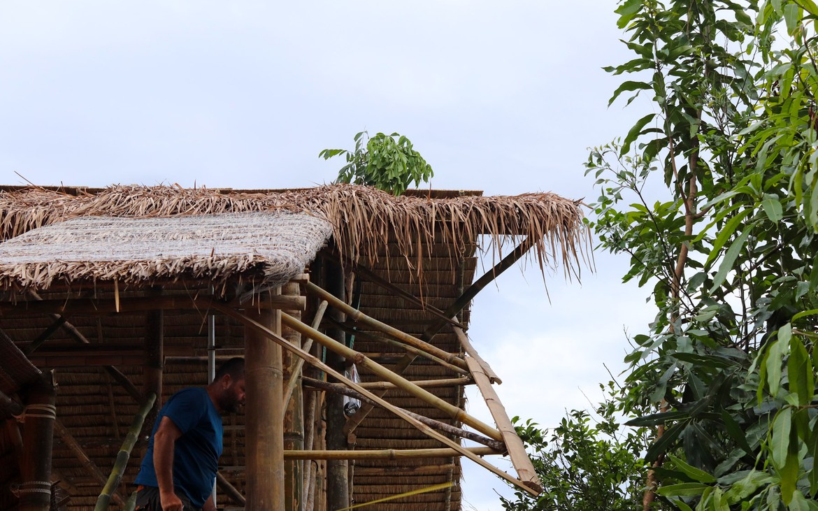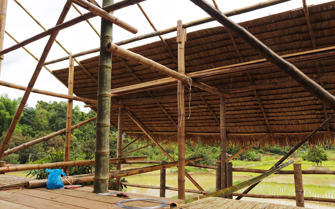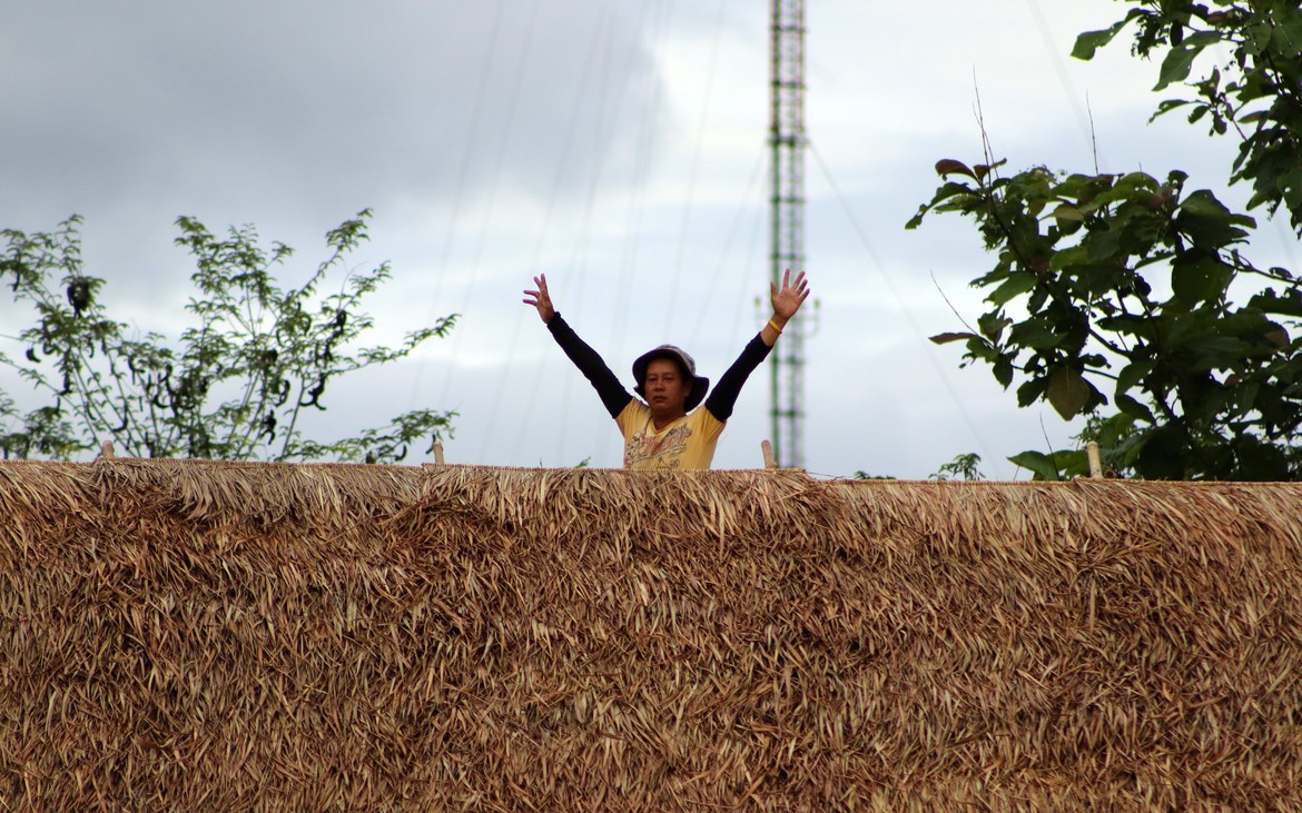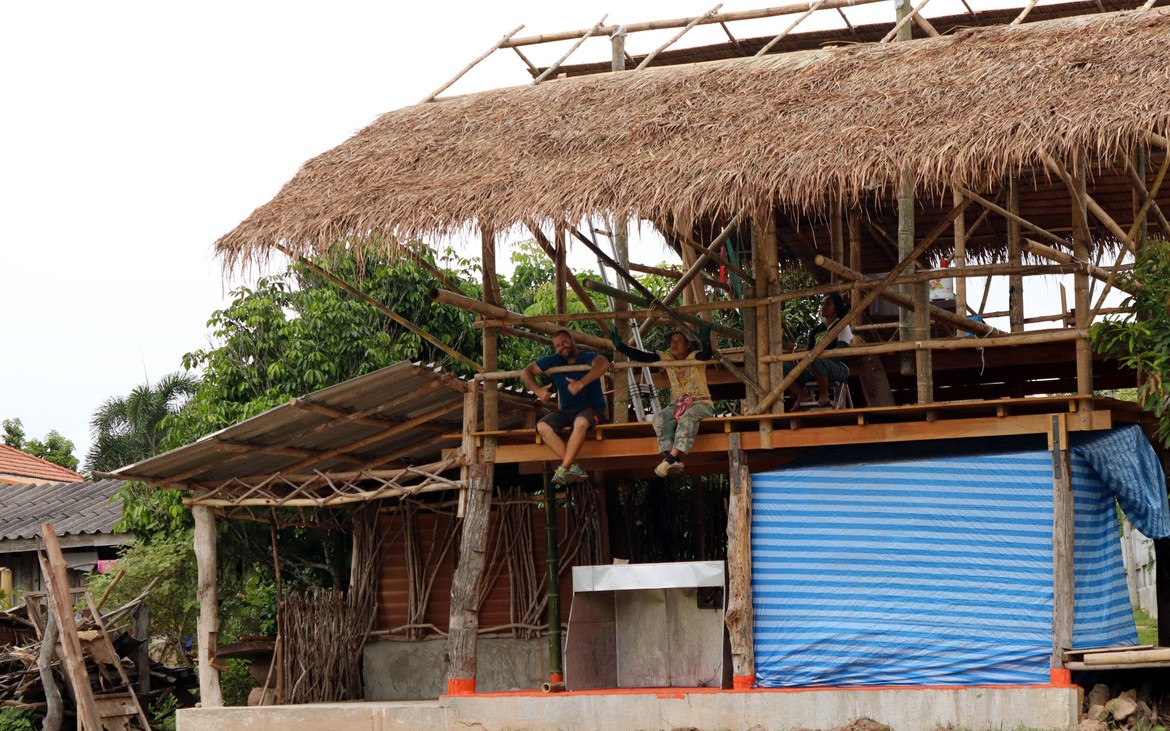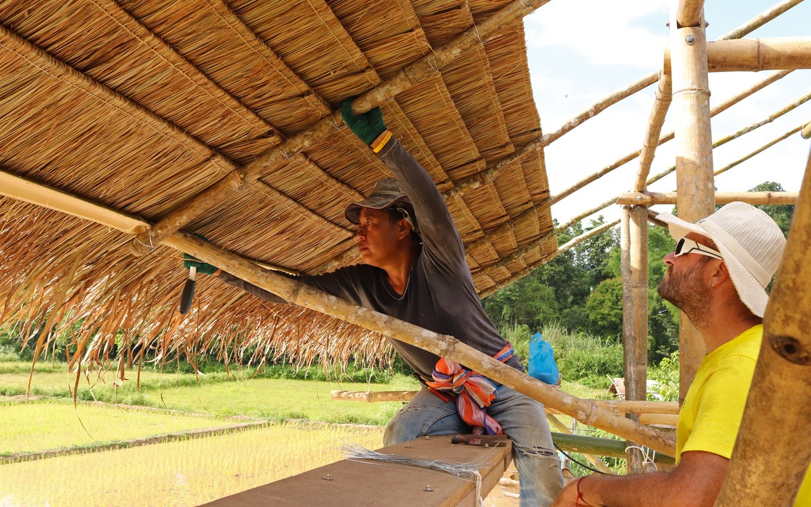 C'est sur un échafaudage à faire pâlir la SUVA (Schweizerische Unfallversicherungsanstalt = Caisse nationale suisse d'assurance en cas d'accidents) que nous fixons les premières nattes de chaume. Et le gagnant du titre pour jouer les acrobates n'est autre que le plus léger d'entre nous, soit... notre ami Kung !