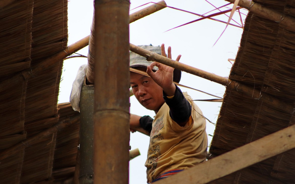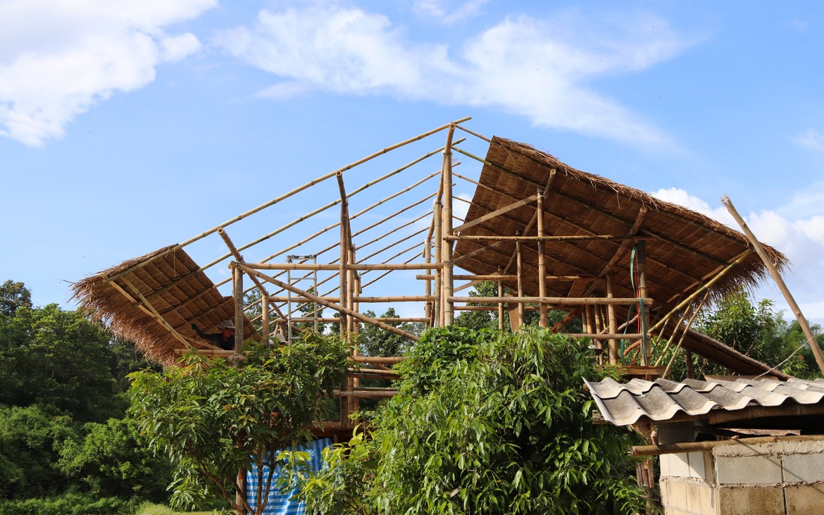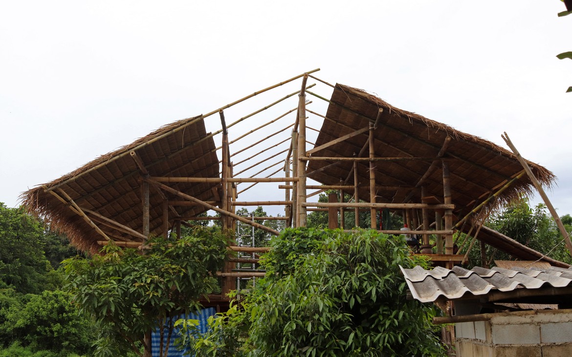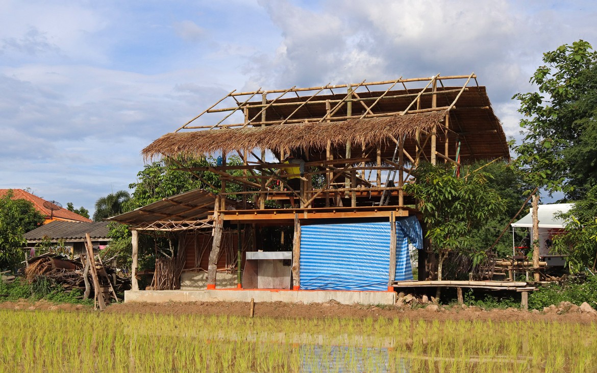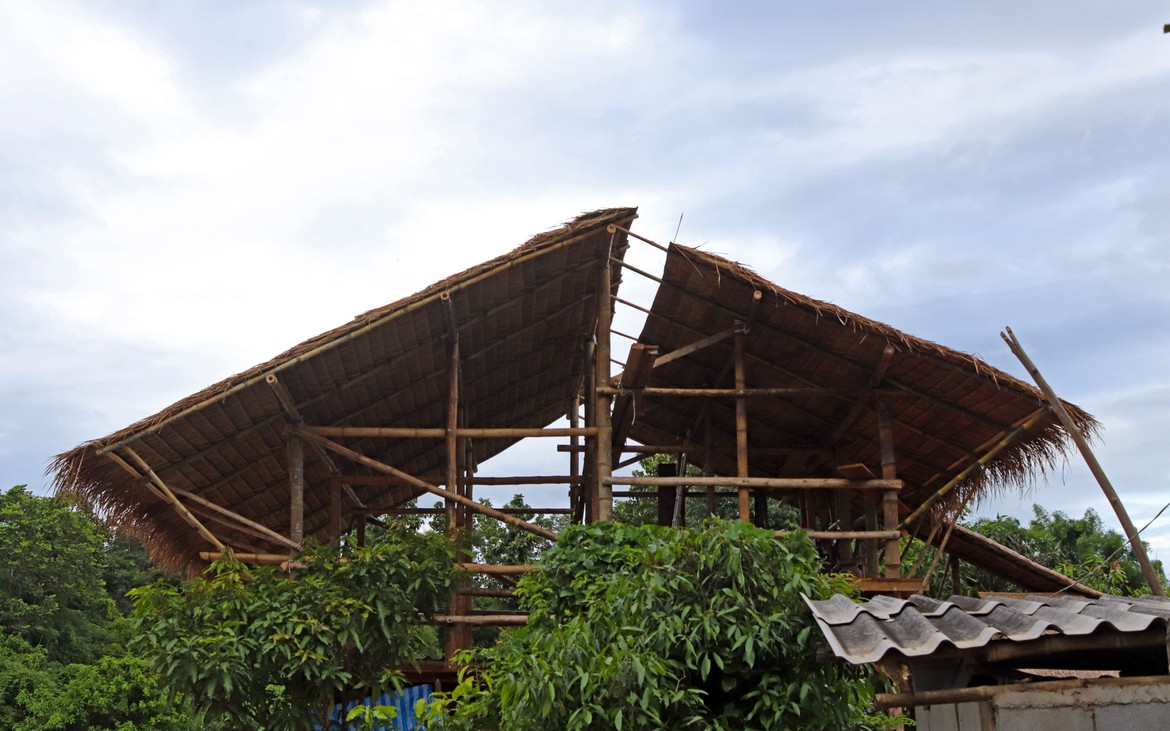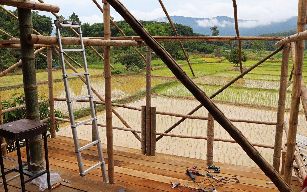 C'est sur un échafaudage à faire pâlir la SUVA (Schweizerische Unfallversicherungsanstalt = Caisse nationale suisse d'assurance en cas d'accidents) que nous fixons les premières nattes de chaume. Et le gagnant du titre pour jouer les acrobates n'est autre que le plus léger d'entre nous, soit... notre ami Kung !