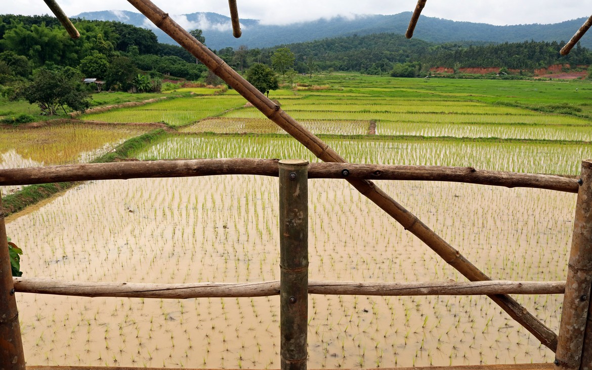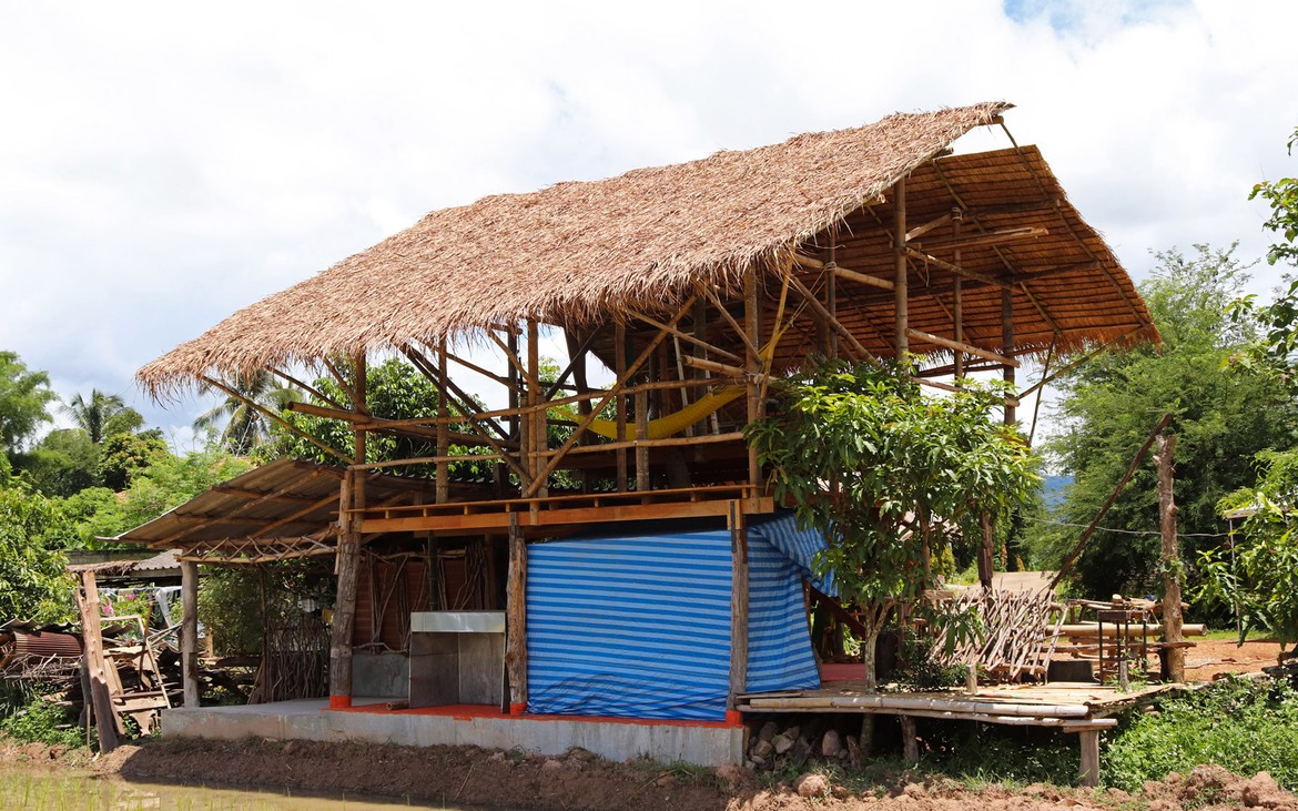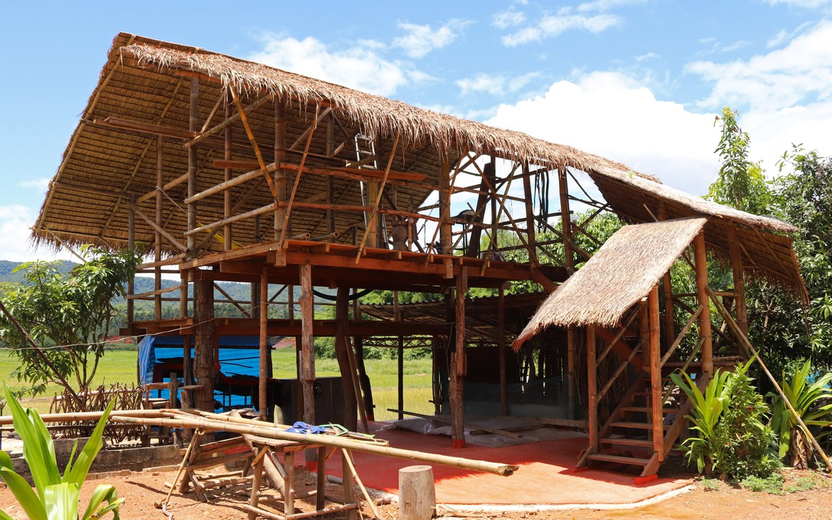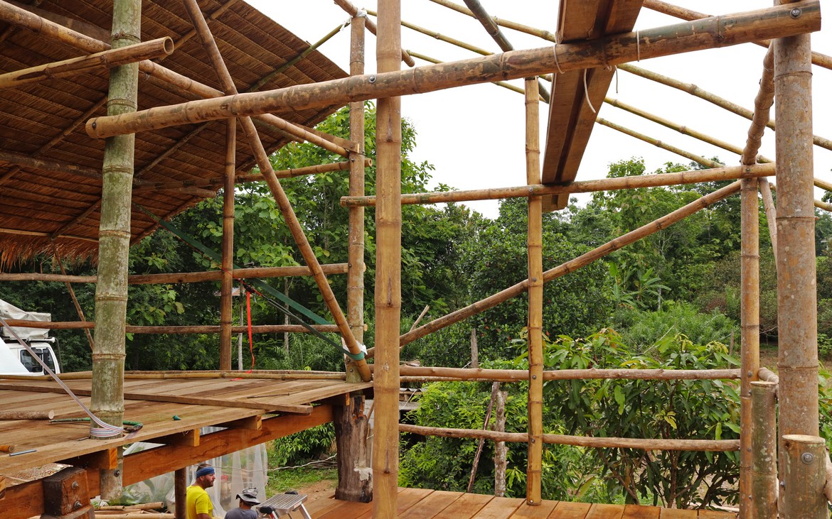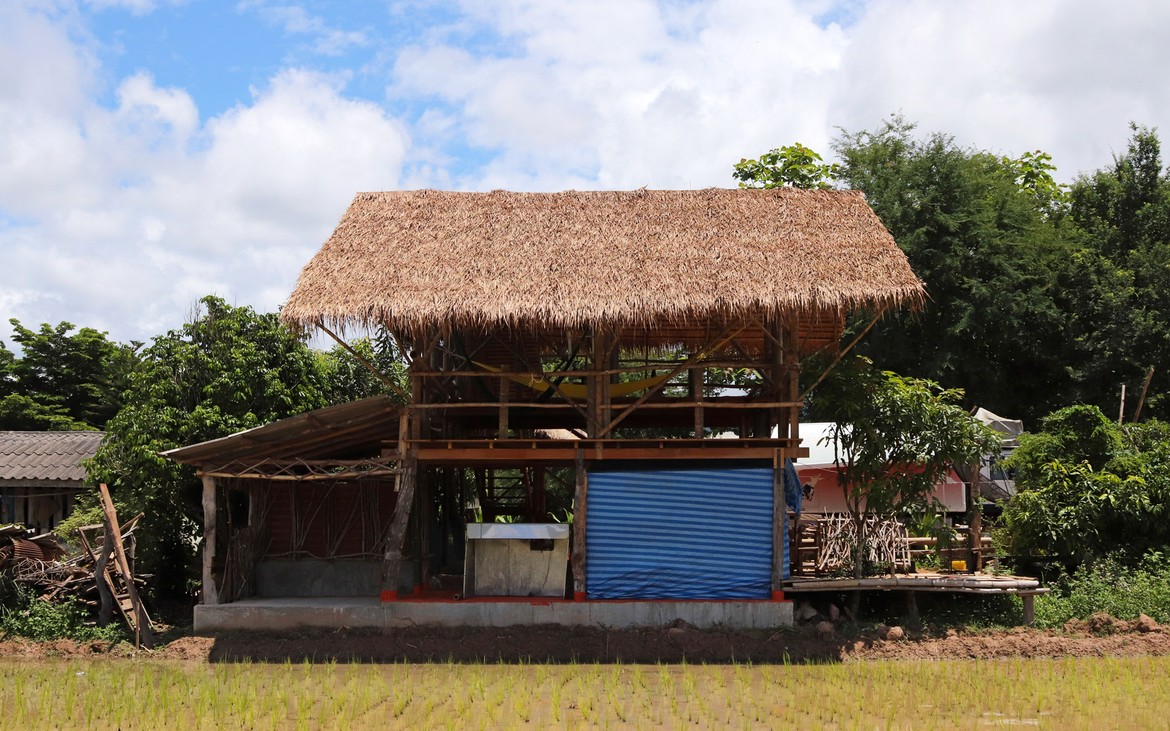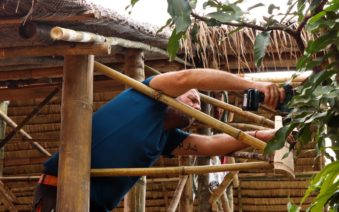 C'est sur un échafaudage à faire pâlir la SUVA (Schweizerische Unfallversicherungsanstalt = Caisse nationale suisse d'assurance en cas d'accidents) que nous fixons les premières nattes de chaume. Et le gagnant du titre pour jouer les acrobates n'est autre que le plus léger d'entre nous, soit... notre ami Kung !