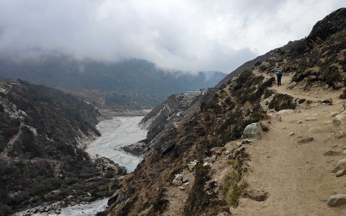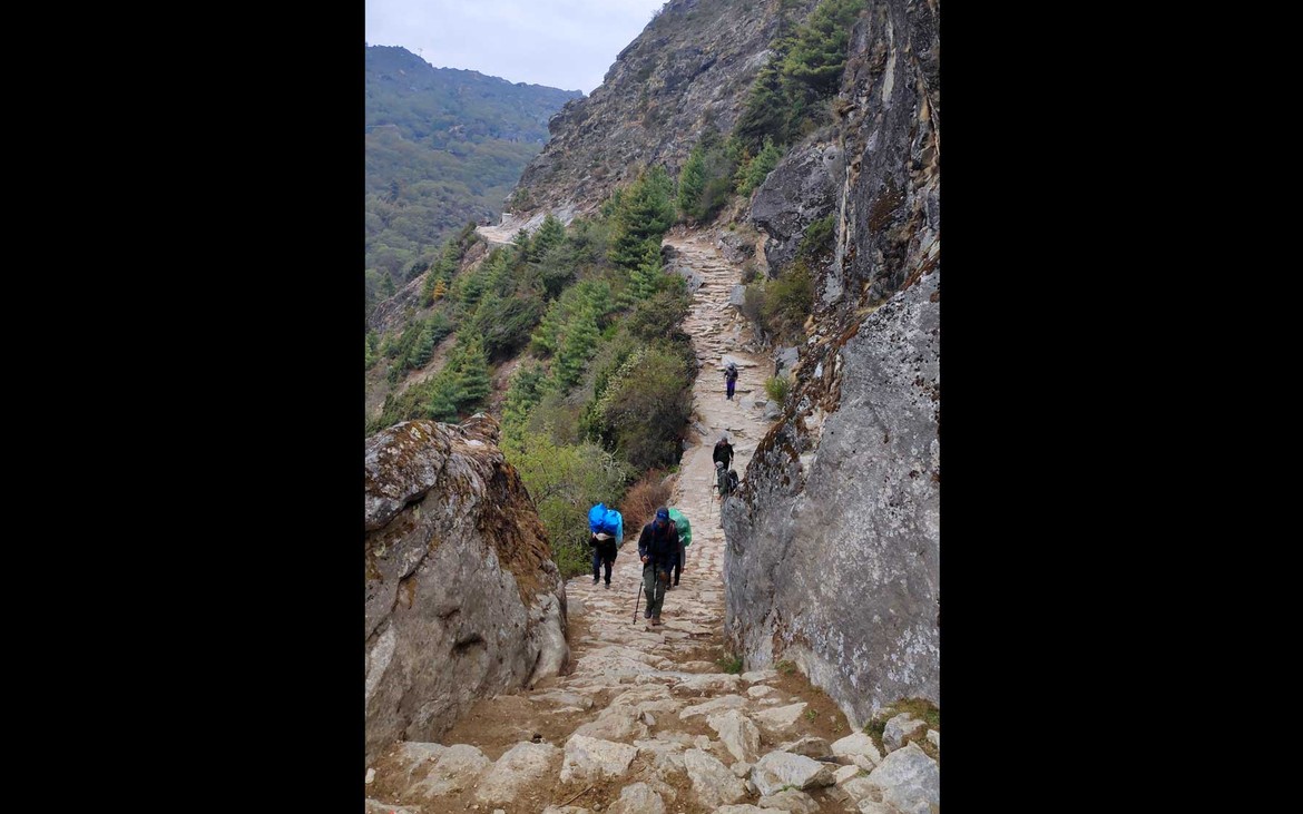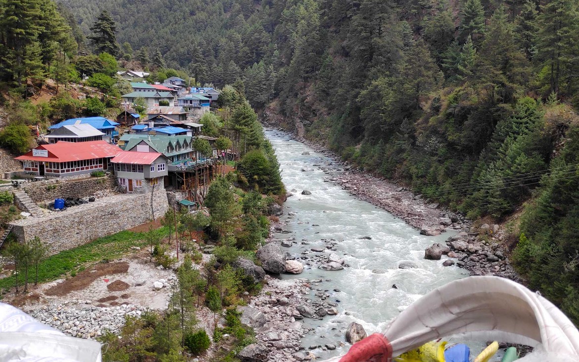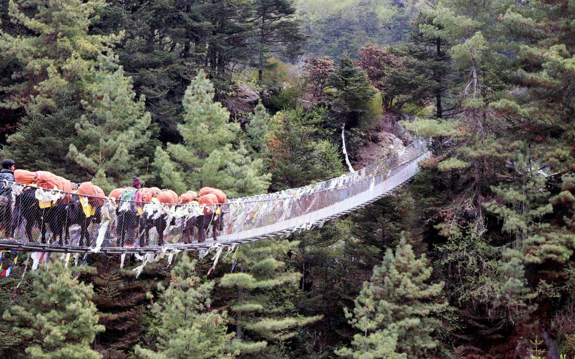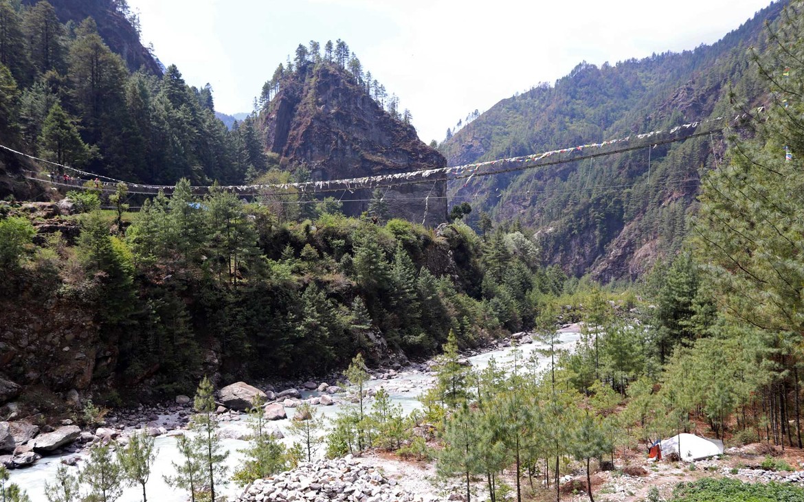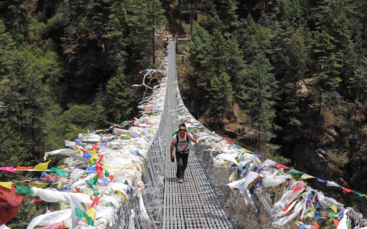 Nous y voilà enfin ! Et pourtant personne n'aurait parier sur Mike qui s'en sort même plutôt aisément à la vue de son état. Nous traversons, entre autres, le plus long des ponts suspendus de notre trek avec ses 136 m, le Larja Dobhan Bridge, renommé Hillary Bridge, en hommage à Sir Edmund Hillary, premier ascensionniste de l’Everest en 1953 ; avant d'entamer les 600 m de dénivelé positif qui nous séparent encore de Namche Bazar (3'440 m), une des montées les plus astreignantes de notre aventure.