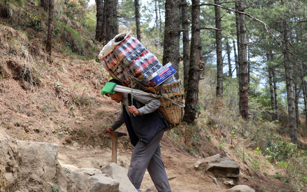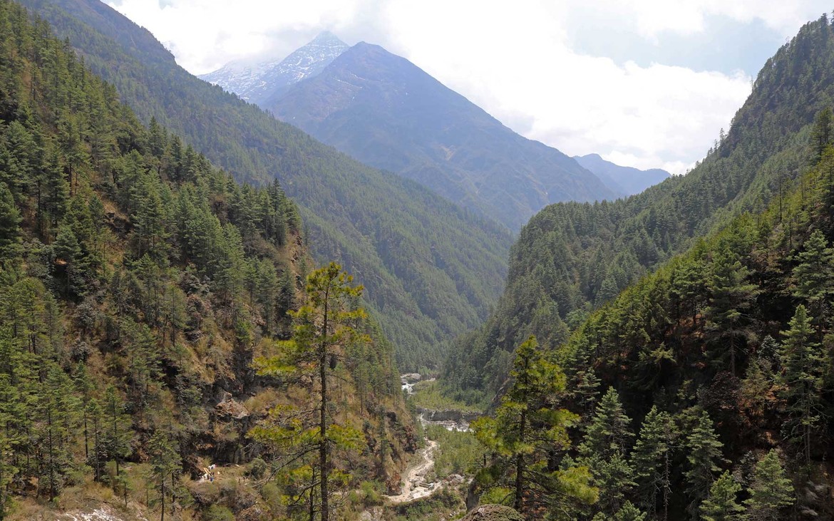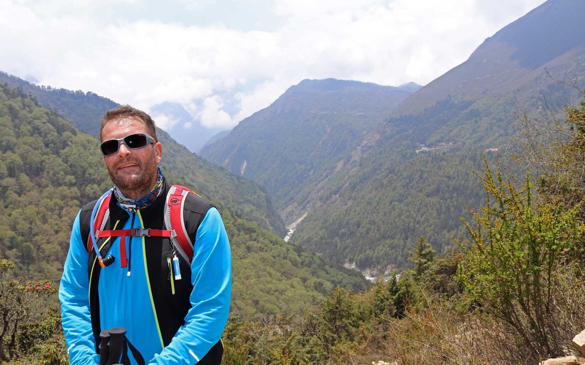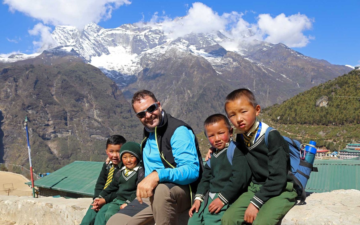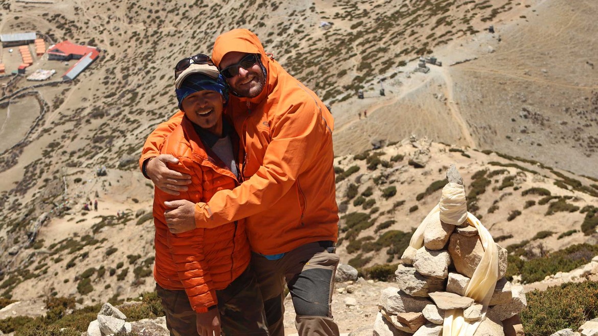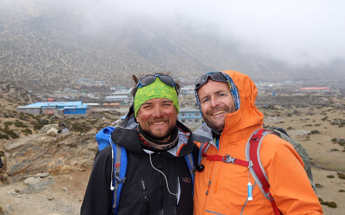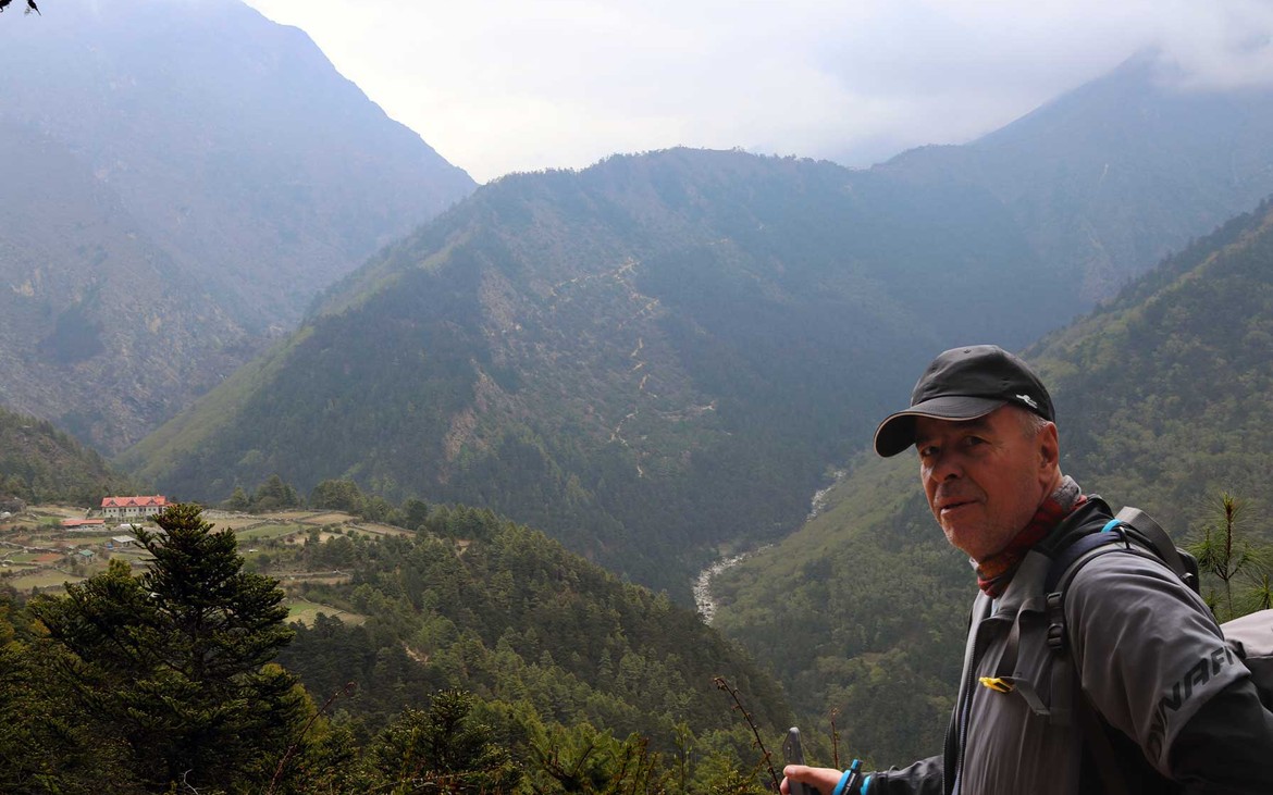 Nous y voilà enfin ! Et pourtant personne n'aurait parier sur Mike qui s'en sort même plutôt aisément à la vue de son état. Nous traversons, entre autres, le plus long des ponts suspendus de notre trek avec ses 136 m, le Larja Dobhan Bridge, renommé Hillary Bridge, en hommage à Sir Edmund Hillary, premier ascensionniste de l’Everest en 1953 ; avant d'entamer les 600 m de dénivelé positif qui nous séparent encore de Namche Bazar (3'440 m), une des montées les plus astreignantes de notre aventure.