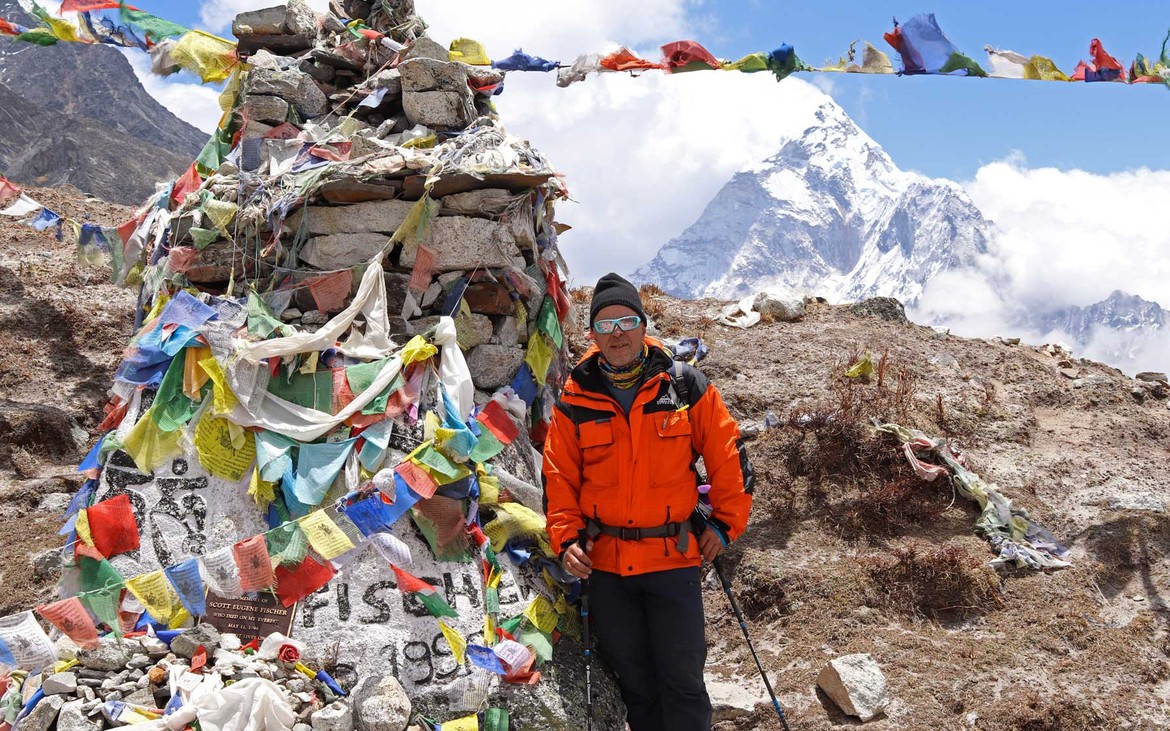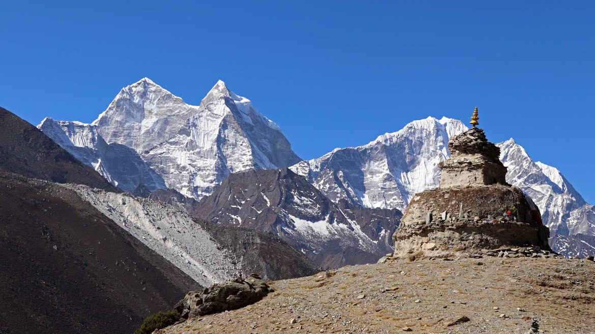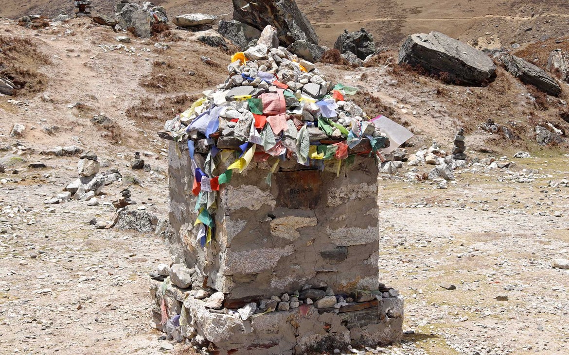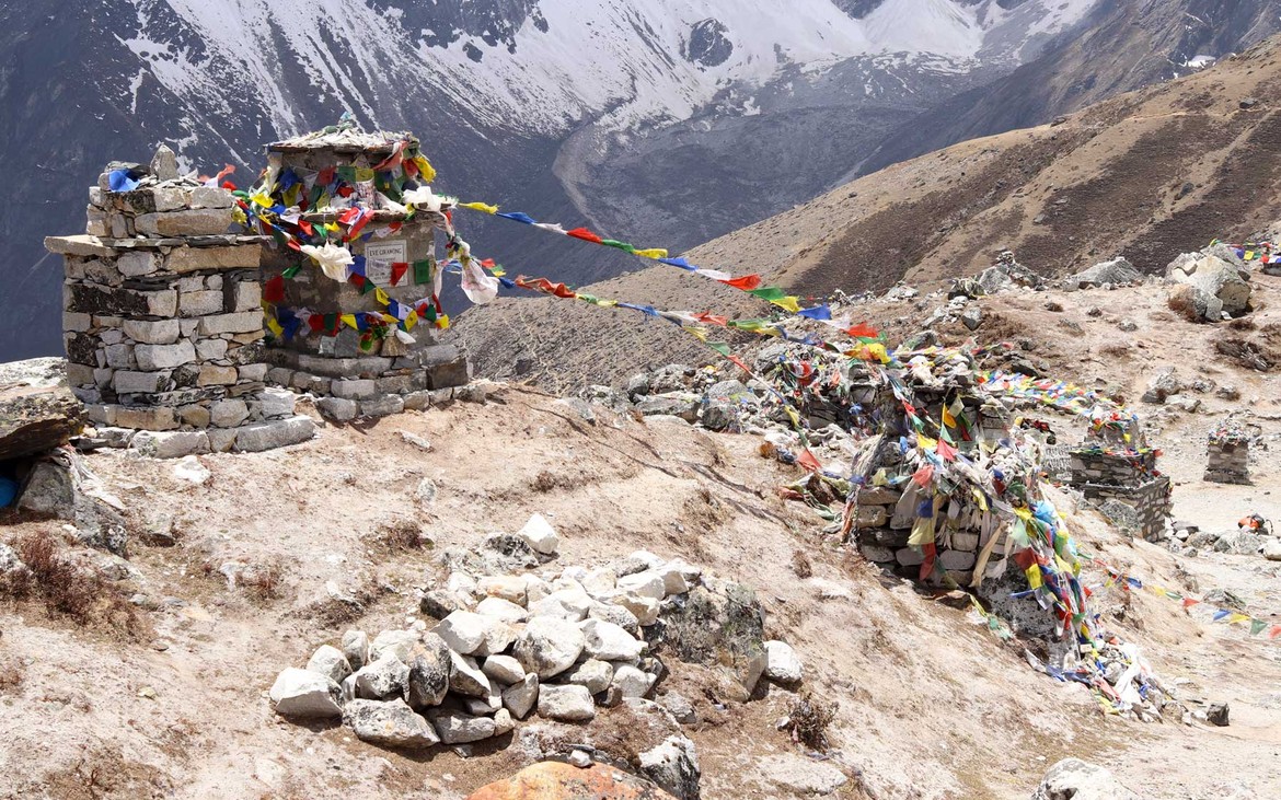 Nous nous approchons des 5'000 m d'altitude et ils se sentent à chaque enjambée. Notre respiration se fait plus épaisse et nos pas sont de plus en plus lourds. En milieu de journée, nous rejoignons Thokla Pass (4'830 m) et ses monuments dédiés aux alpinistes décédés sur l'Everest. On y trouve des mémoriaux de personnalités telles que Rob Hall ou Scott Fisher. C'est assez impressionnant et touchant de voir ces pyramides de pierre dressées vers le firmament, revêtues des drapeaux de prières tibétains multicolores qui battent l'air au rythme du vent, emportant leurs messages de paix et de rédemption vers les cieux.