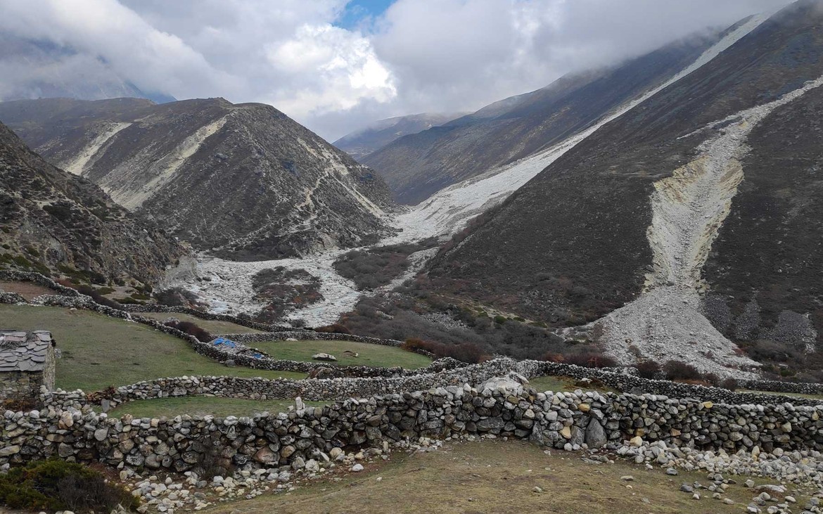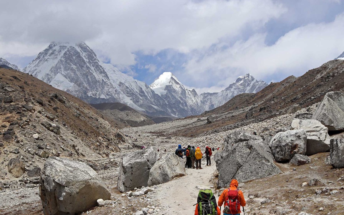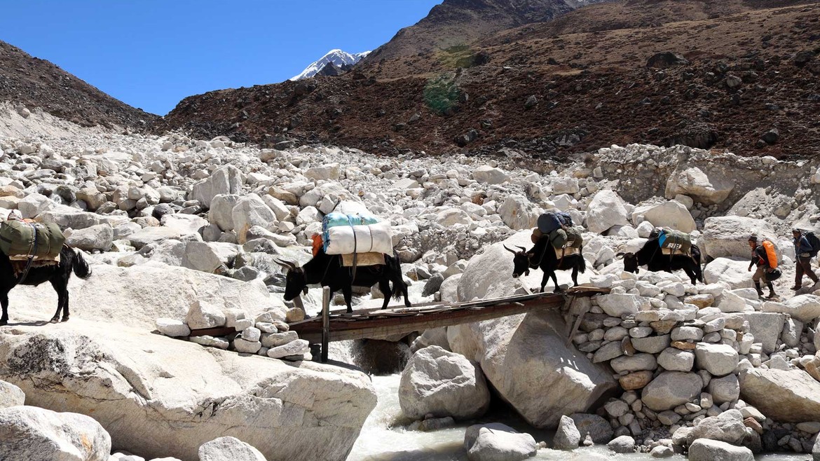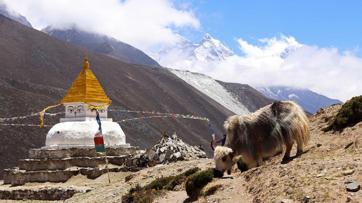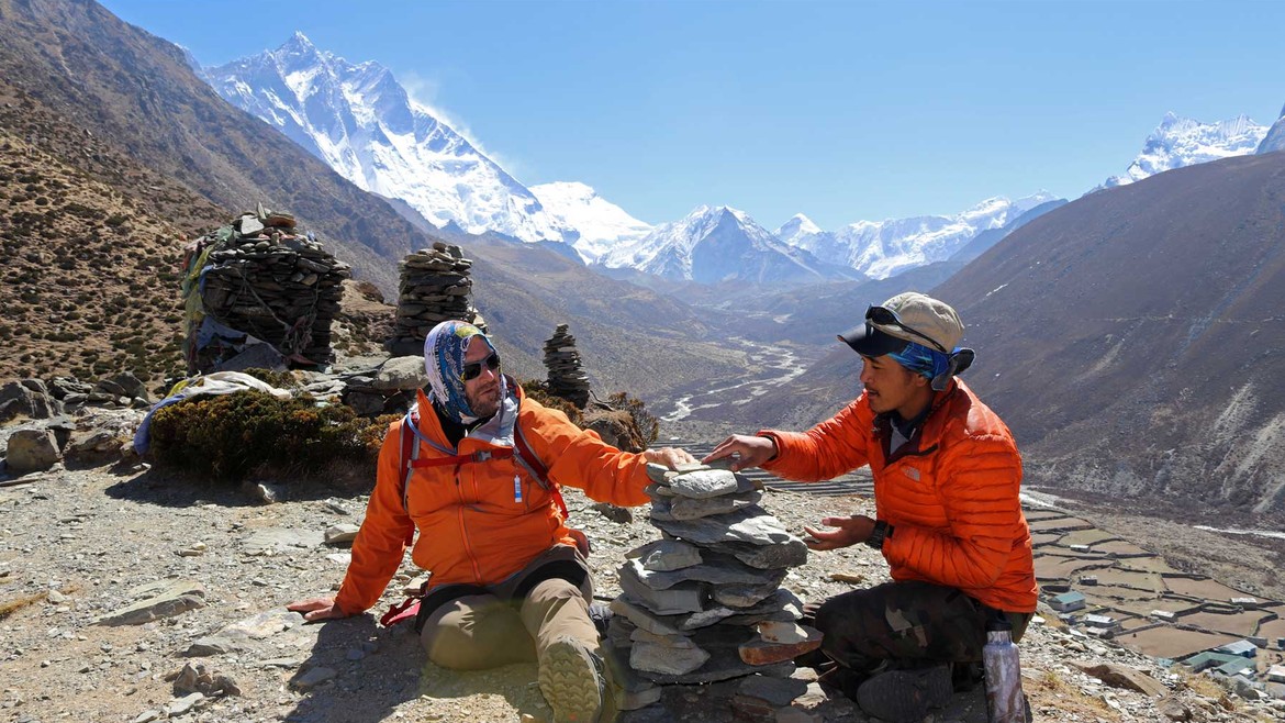 Nous nous approchons des 5'000 m d'altitude et ils se sentent à chaque enjambée. Notre respiration se fait plus épaisse et nos pas sont de plus en plus lourds. En milieu de journée, nous rejoignons Thokla Pass (4'830 m) et ses monuments dédiés aux alpinistes décédés sur l'Everest. On y trouve des mémoriaux de personnalités telles que Rob Hall ou Scott Fisher. C'est assez impressionnant et touchant de voir ces pyramides de pierre dressées vers le firmament, revêtues des drapeaux de prières tibétains multicolores qui battent l'air au rythme du vent, emportant leurs messages de paix et de rédemption vers les cieux.
