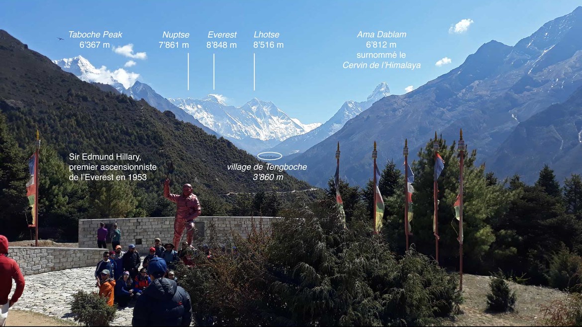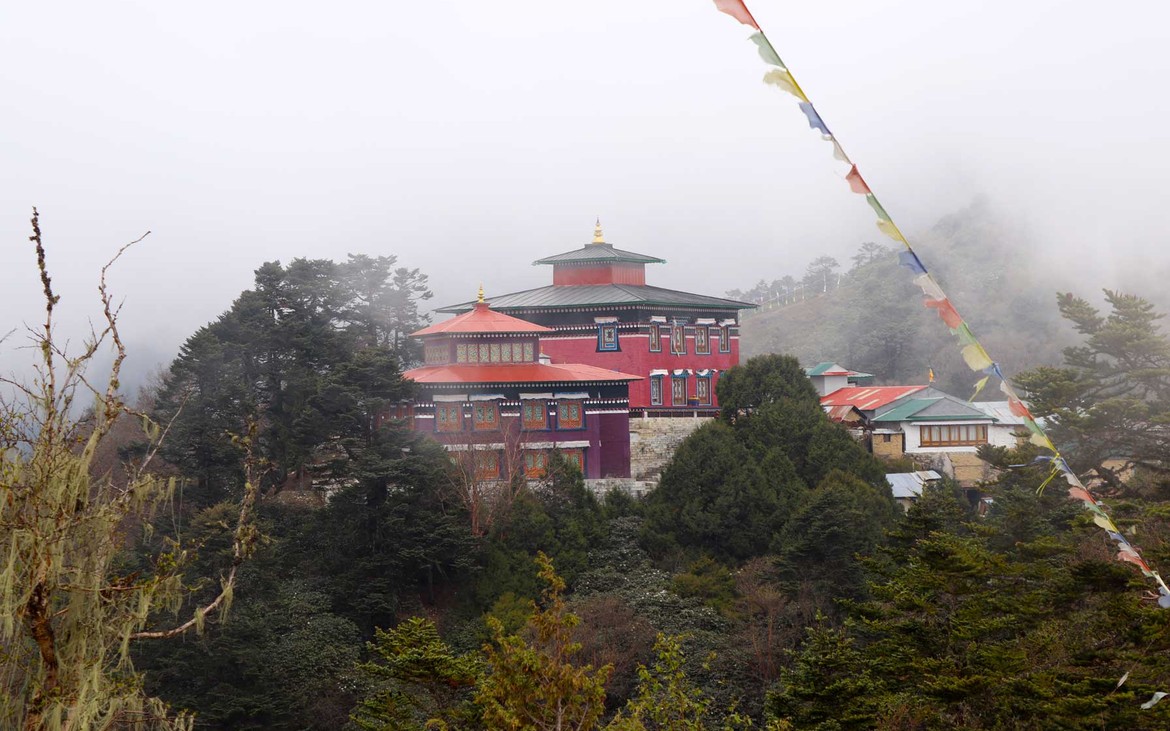 L'étape du jour est Tengboche (3'860 m) et il se mérite par la montée non sans peine des 600 m qui le séparent de Phunke Tenga (3'250 m). Son monastère est un des plus populaires du Népal. Il doit certainement sa renommée au panorama unique qui l’entoure : proche du magnifique Ama Dablam (6'856 m), aussi appelé le Cervin de l’Himalaya de par sa forme, il offre aussi une vue d’exception sur la Triple Couronne (Everest 8'848 m, Lhotse 8'516 m, Nuptse 7'861 m). Nous n’en profiterons malheureusement pas, n’ayant pas dégainé nos appareils photo au moment opportun: un épais brouillard fait son apparition en fin de journée et nous coupe tout dégagement sur les sommets enneigés alentours...