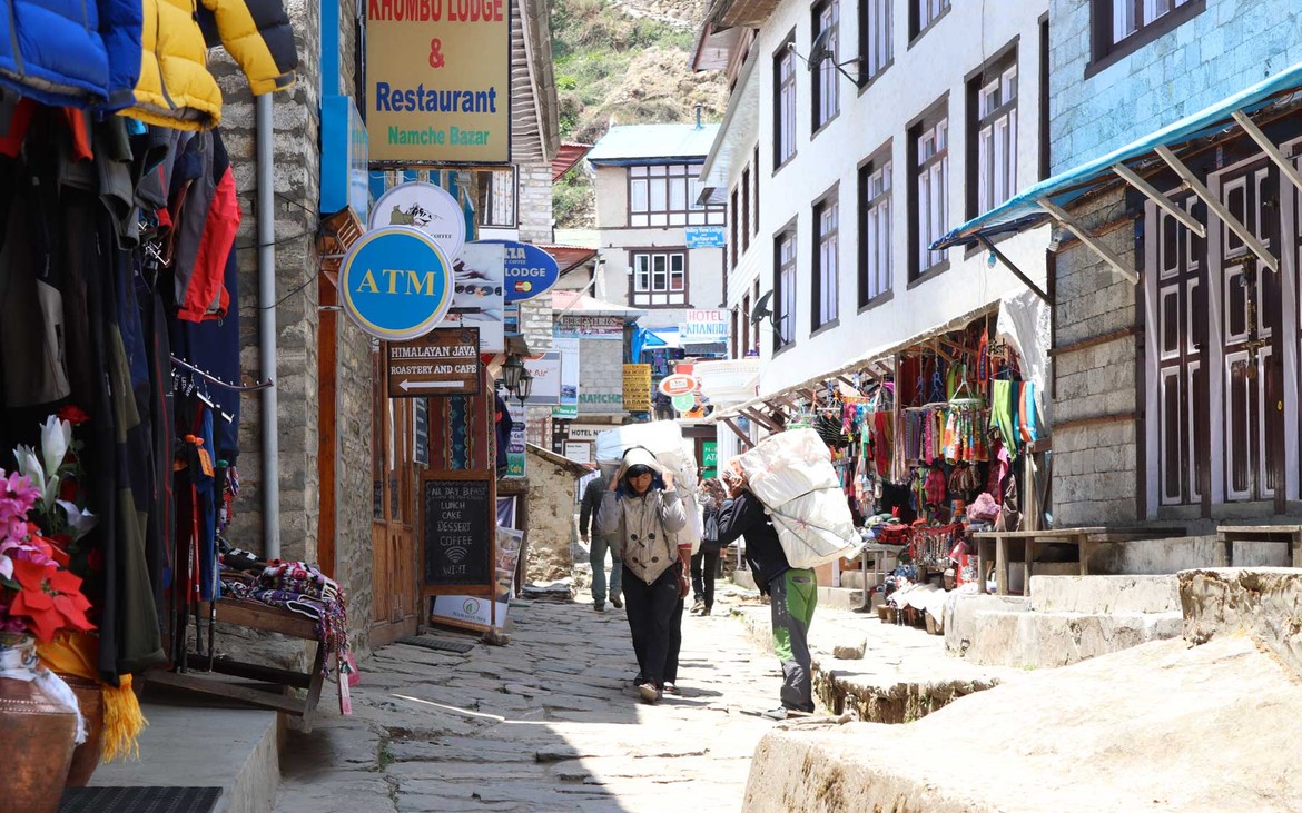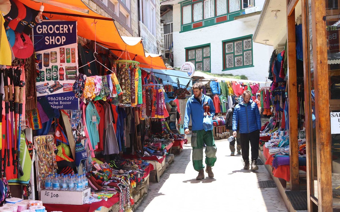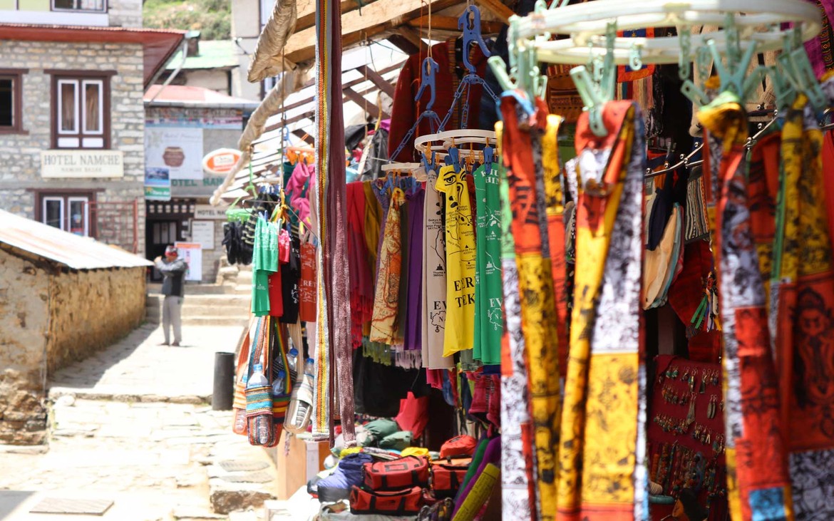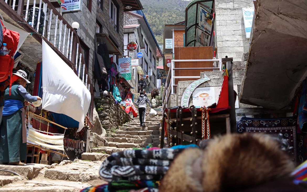 Namche Bazar, surnommée la Capitale des Sherpas, est une véritable petite ville blottie à flanc de montagne. Elle abrite de nombreux tea houses, restaurants, bars, et boutiques en tout genre. Nous y resterons deux jours, le temps pour nous de nous acclimater à l'altitude et de soigner les petits bobos. On envoie papa se dégourdir les jambes avec le guide, tandis que nous faisons plutôt de la petite balade et du lèche-vitrine.