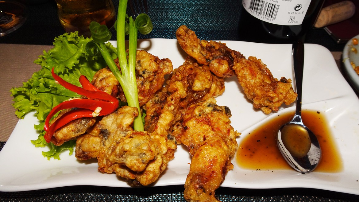 Le soir venu, nous décidons, sur les bons conseils de notre hôte Peterhans, de nous retrouver autour d’une bonne table de Siem Reap pour fêter les retrouvailles : The Neth Socheata . Nous y dégustons des plats locaux, et en particulier leurs grenouilles : attention, rien à voir avec les cuisses de grenouille apprêtées à l’Européenne, aillées et persillées, non, il s’agit plutôt de bestioles entières frites !! De prime abord pas très ragoûtant, ce mets est pourtant étonnamment savoureux. Avis aux amateurs !