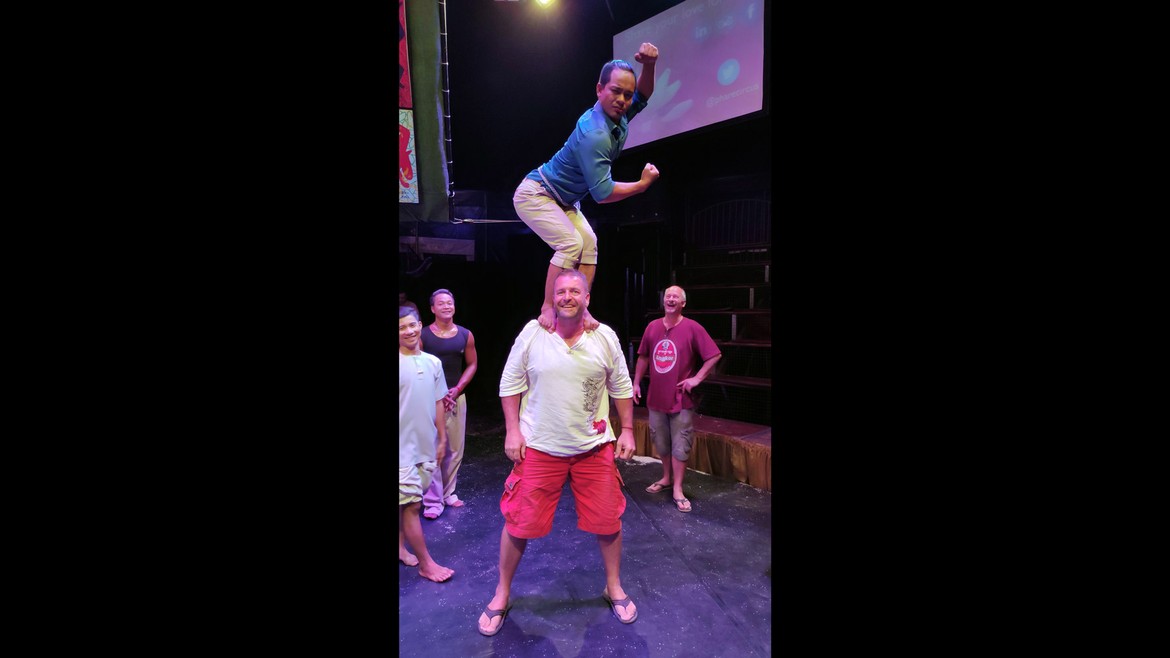 Notre programme se poursuit avec une soirée récréative au Phare, The Cambodian Circus en présence des YAKA et de Roland. Nous avons beaucoup de plaisir à découvrir ces jeunes talents. Musiciens, acrobates, humoristes, ils combinent habilement leurs disciplines à notre plus grande satisfaction. Le spectacle se termine avec la rencontre des artistes et quelques clichés souvenirs.