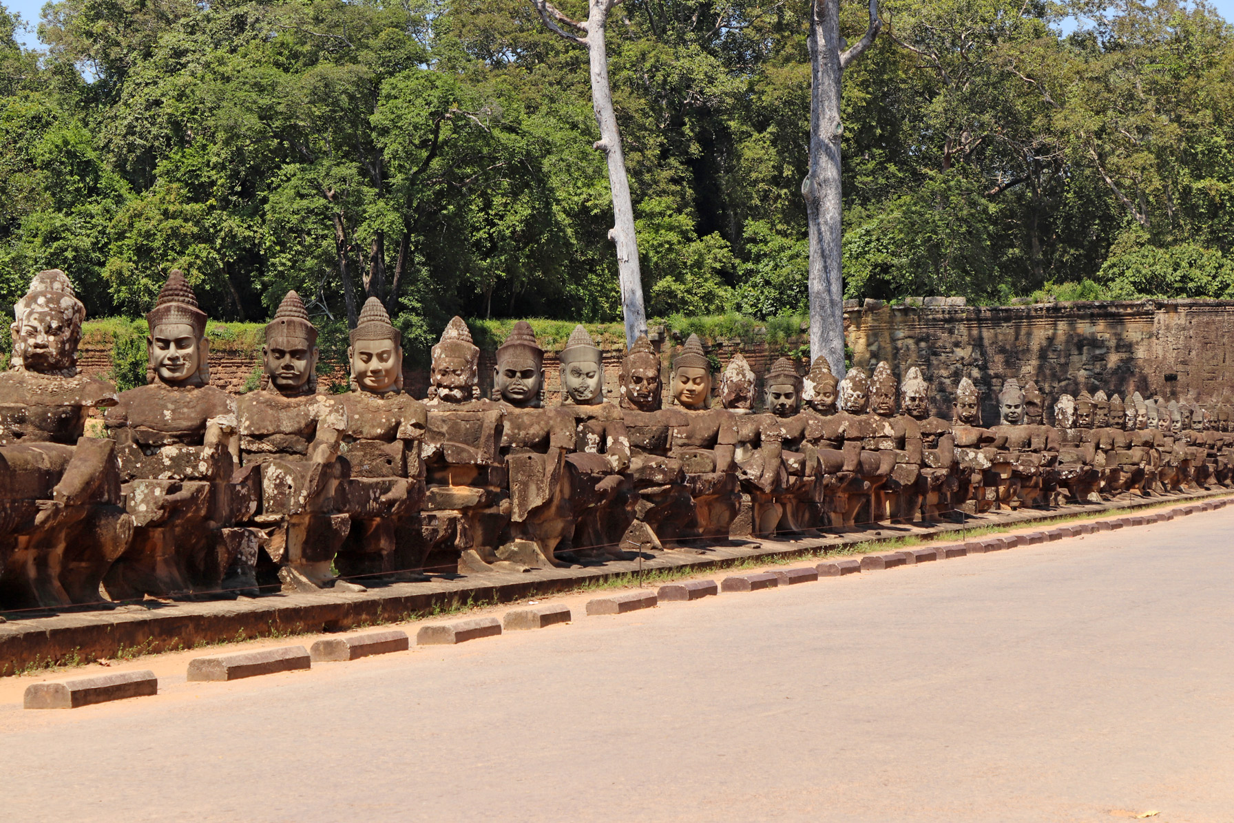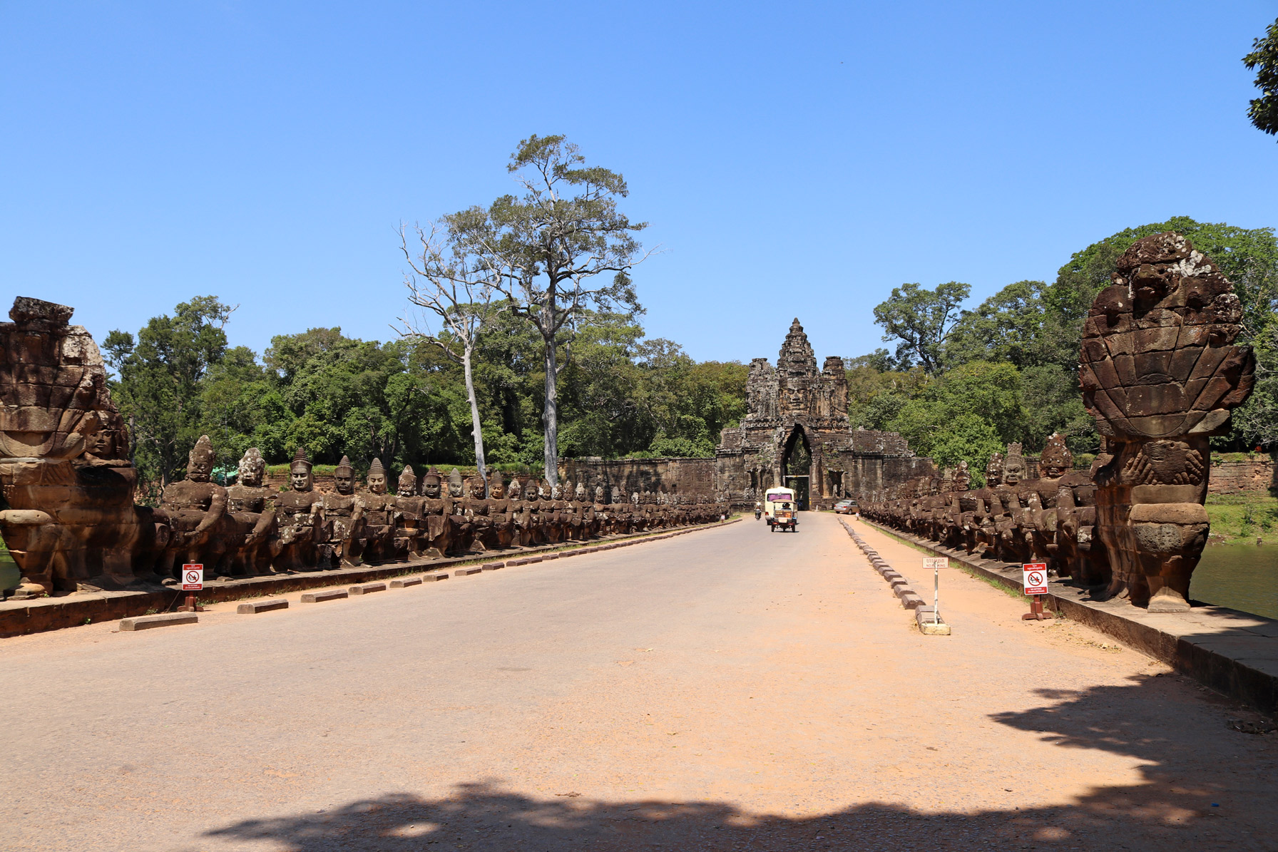 Angkor Thom est la capitale sous Jayavarman VII. Nous accédons à la cité par le mur d’enceinte Sud et sa porte monumentale ornée de visages. De part et d’autre du pont qui traverse les douves, on peut voir des yakṣa et des nâga, respectivement des géants et des serpents, caractères de la mythologie hindoue.