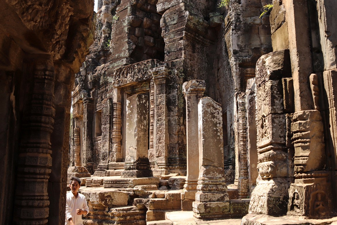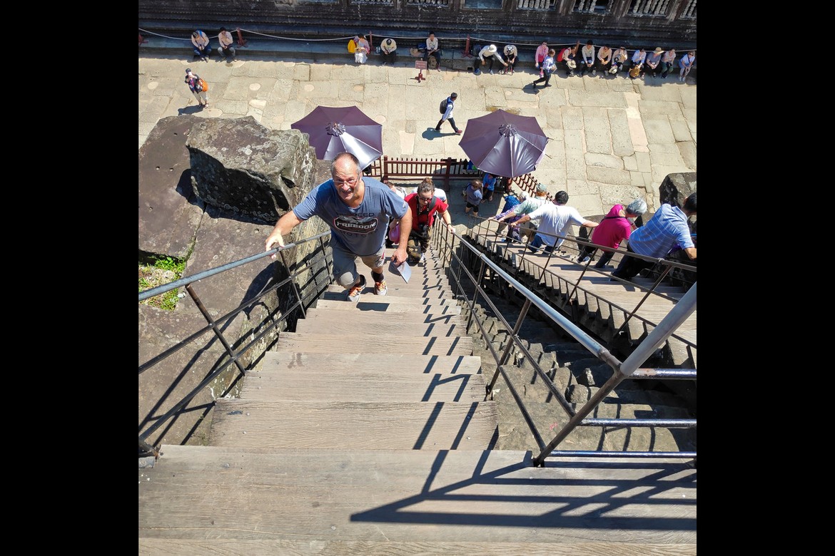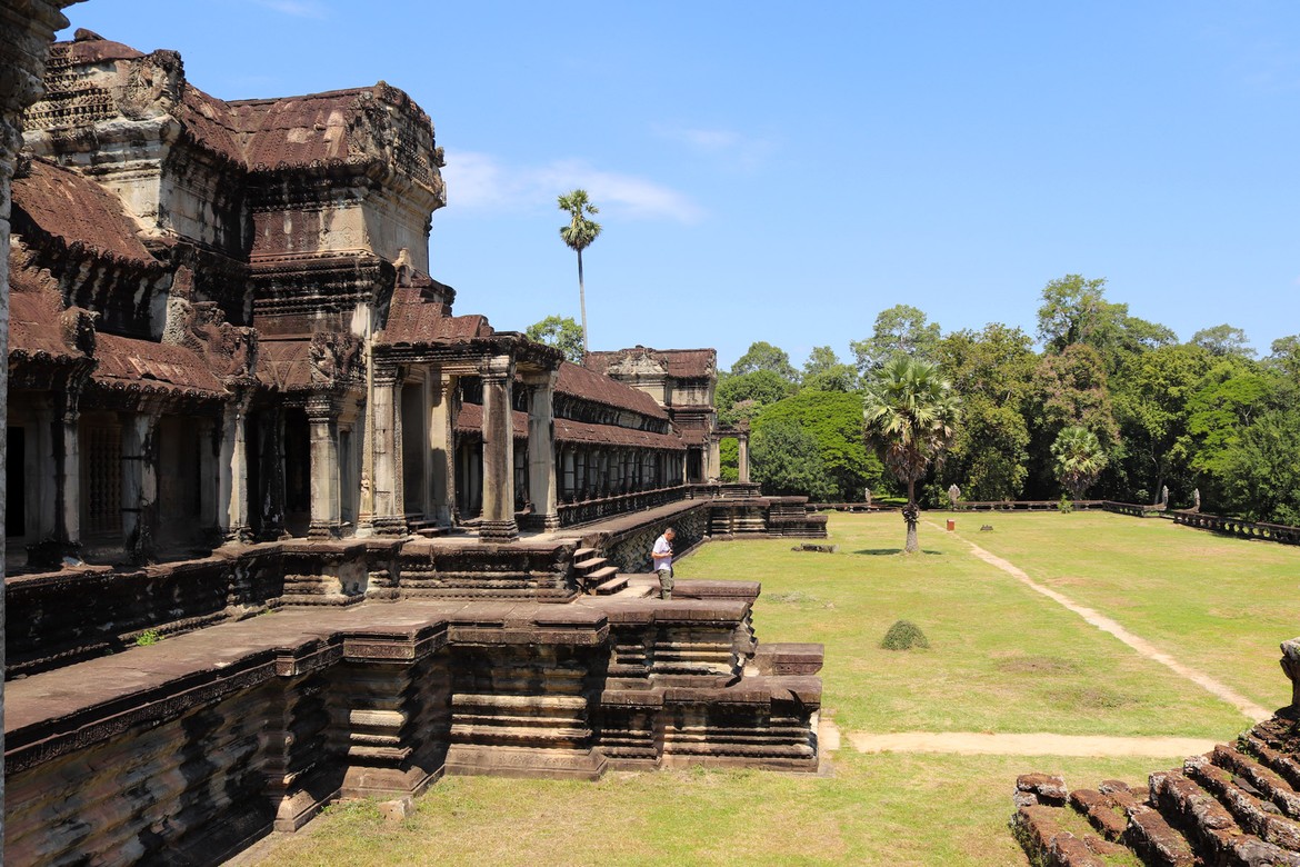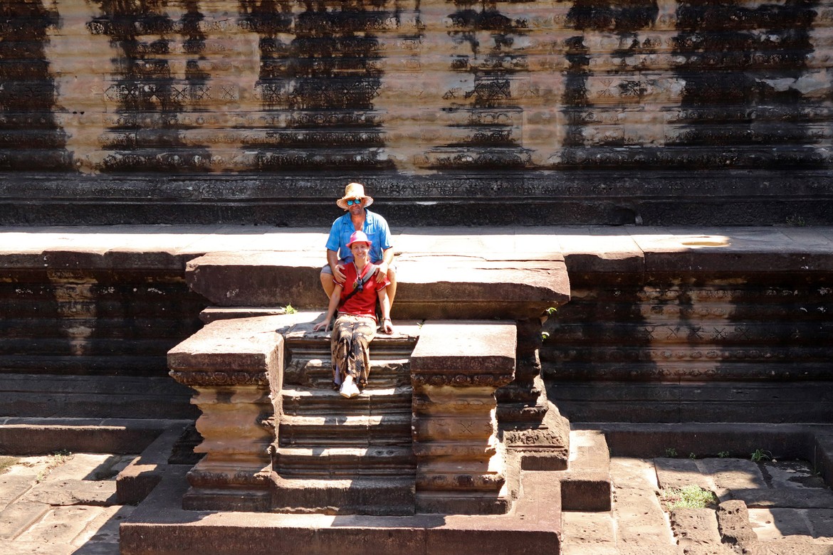 Aussitôt arrivés, nous perdons de vue Azam et Samir. Nous avons juste le temps d’immortaliser le moment après les premiers murs d’enceinte avant que nos chemins ne se séparent pour la journée. Nous parcourons le site et les galeries avec Roland ; croisons quelques moines dont la présence à Angkor est toujours très marquée ; et découvrons les apsaras, ces nymphes célestes sculptées qui agrémentent les murs d’enceintes. Notre première visite se termine par l’ascension particulièrement raide de l’escalier qui mène à l’endroit le plus sacré et le plus vénéré du temple : une manière de marquer la montée du pèlerin vers les cieux et le divin. Ce promontoire offre une vue imprenable sur le site archéologique et ses richesses ainsi que sur la jungle attenante.