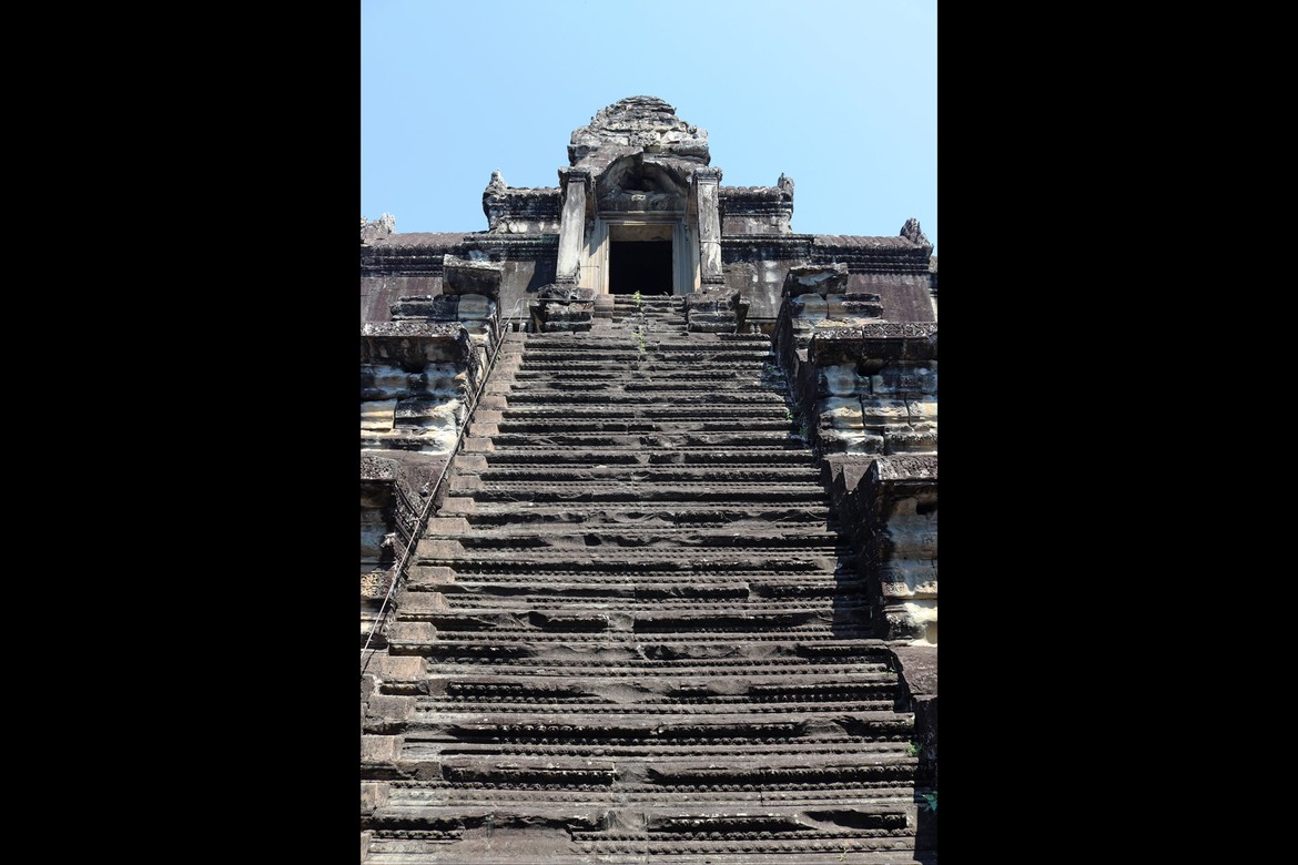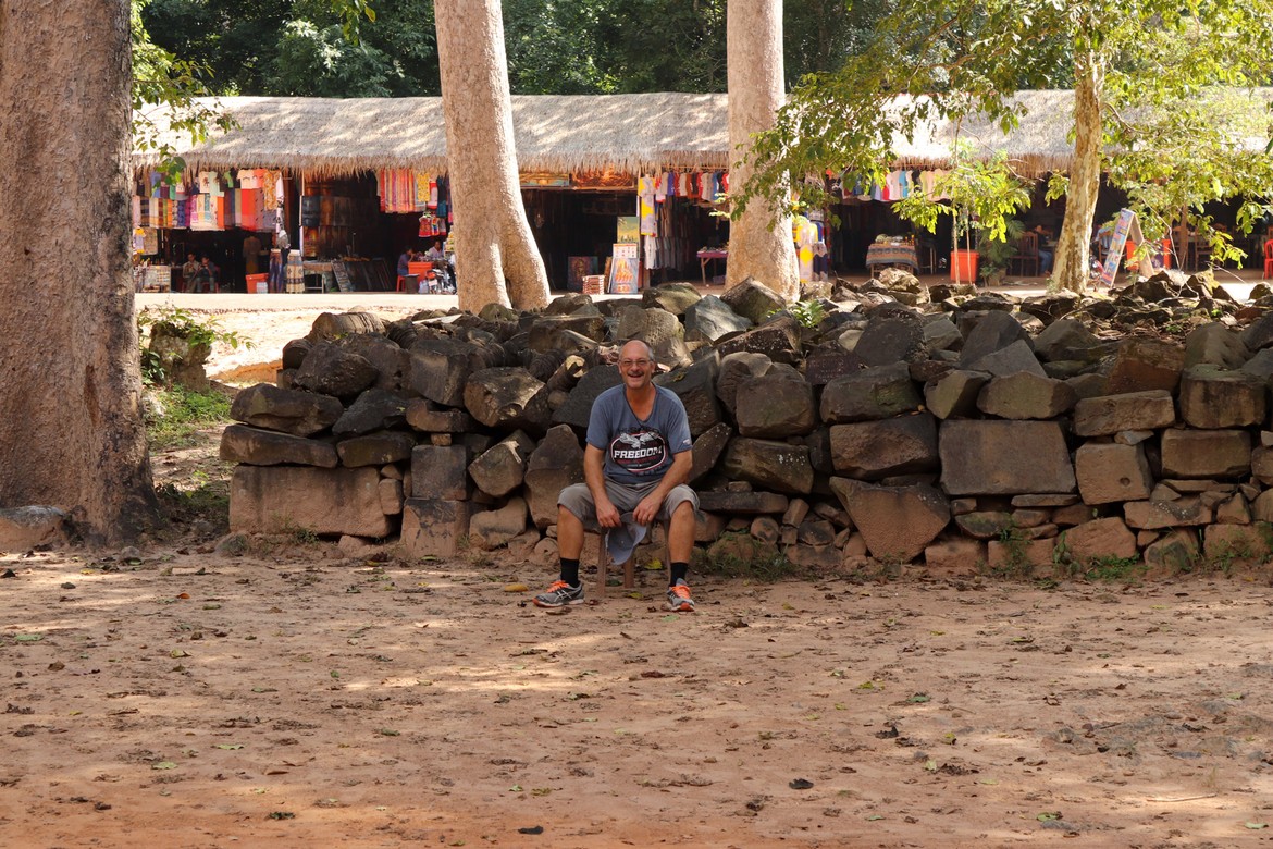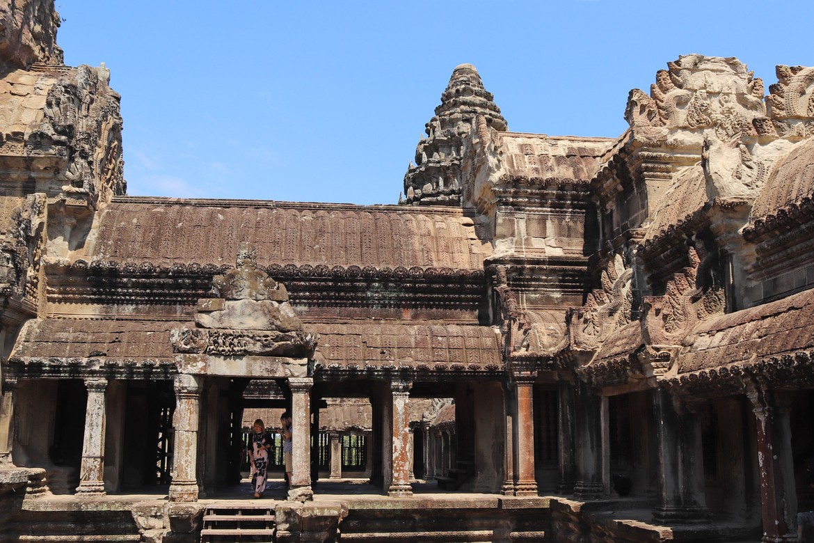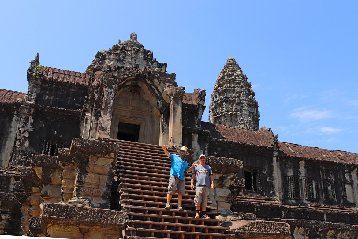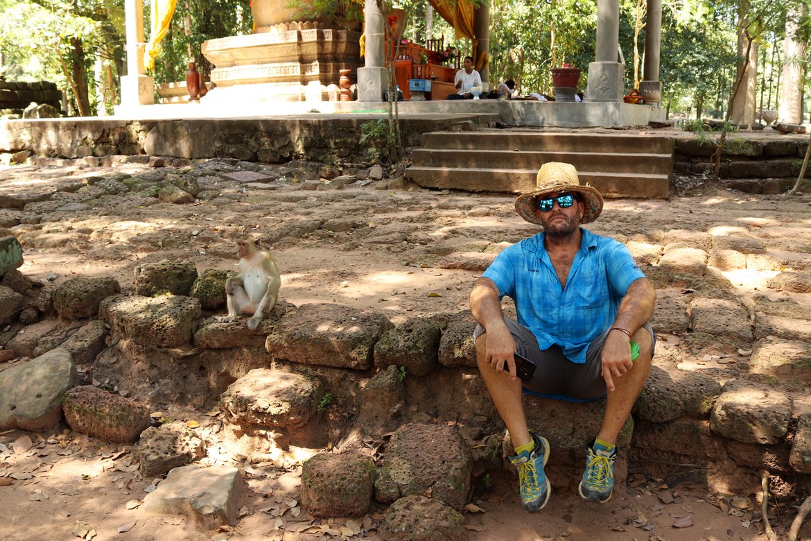 Aussitôt arrivés, nous perdons de vue Azam et Samir. Nous avons juste le temps d’immortaliser le moment après les premiers murs d’enceinte avant que nos chemins ne se séparent pour la journée. Nous parcourons le site et les galeries avec Roland ; croisons quelques moines dont la présence à Angkor est toujours très marquée ; et découvrons les apsaras, ces nymphes célestes sculptées qui agrémentent les murs d’enceintes. Notre première visite se termine par l’ascension particulièrement raide de l’escalier qui mène à l’endroit le plus sacré et le plus vénéré du temple : une manière de marquer la montée du pèlerin vers les cieux et le divin. Ce promontoire offre une vue imprenable sur le site archéologique et ses richesses ainsi que sur la jungle attenante.