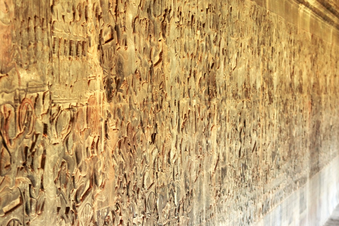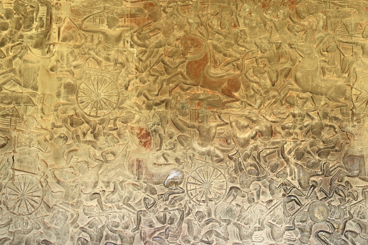 Ses caractéristiques sont ses douves, ses murs d’enceinte et ses galeries ornées de bas-reliefs relatant des épopées sanskrites de la mythologie hindoue ou des scènes historiques du roi Suryavarman II.