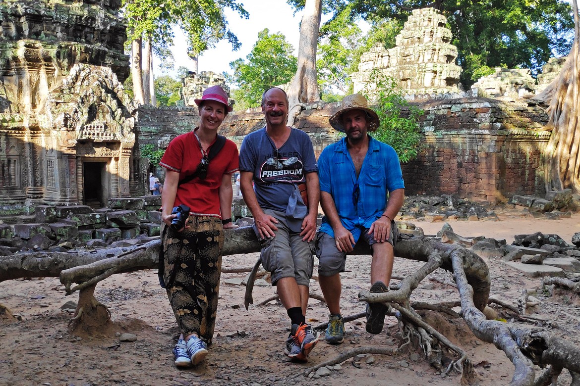 C’est le débat aujourd’hui : Temples d’Angkor à vélo ou en tuk-tuk ? Les YAKA sont déjà partis de leur côté pour prendre leur temps avec les enfants. Mike et Roland qui ont déjà visité le site le savent. C’est grand, c’est très grand et il fait chaud ! Le temps passe, la chaleur augmente, nous finissons par partir tous ensemble en tuk-tuk dans le plus grand des chaos et pour cause… Je vous plante le décor : nous avions réservé deux véhicules, nous en avons annulé un et nous voilà à cinq dans le même tricycle motorisé ! En plus, c’est la soupe à la grimace du côté de ceux qui se réjouissaient de faire du deux roues. Il ne faudra guère plus des 2 km qui nous séparent des Angkor Park Pass Ticket Counters, autrement dit des guichets du site archéologique, pour que la situation ne vire à l’incident diplomatique ! Afin de faire retomber rapidement les tensions, et de nous sentir plus à nos aises durant les trajets motorisés de la journée, nous suggérons de louer un véhicule supplémentaire comme prévu initialement.