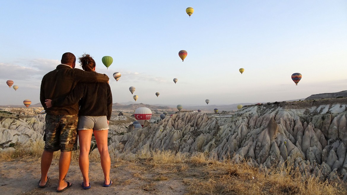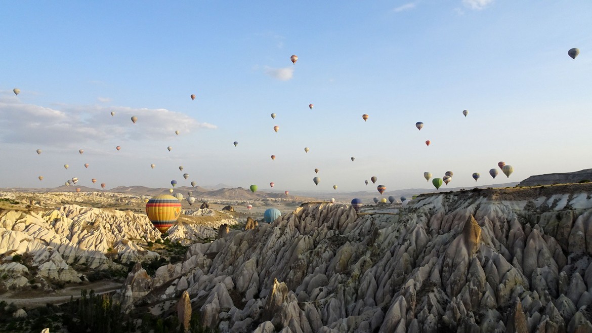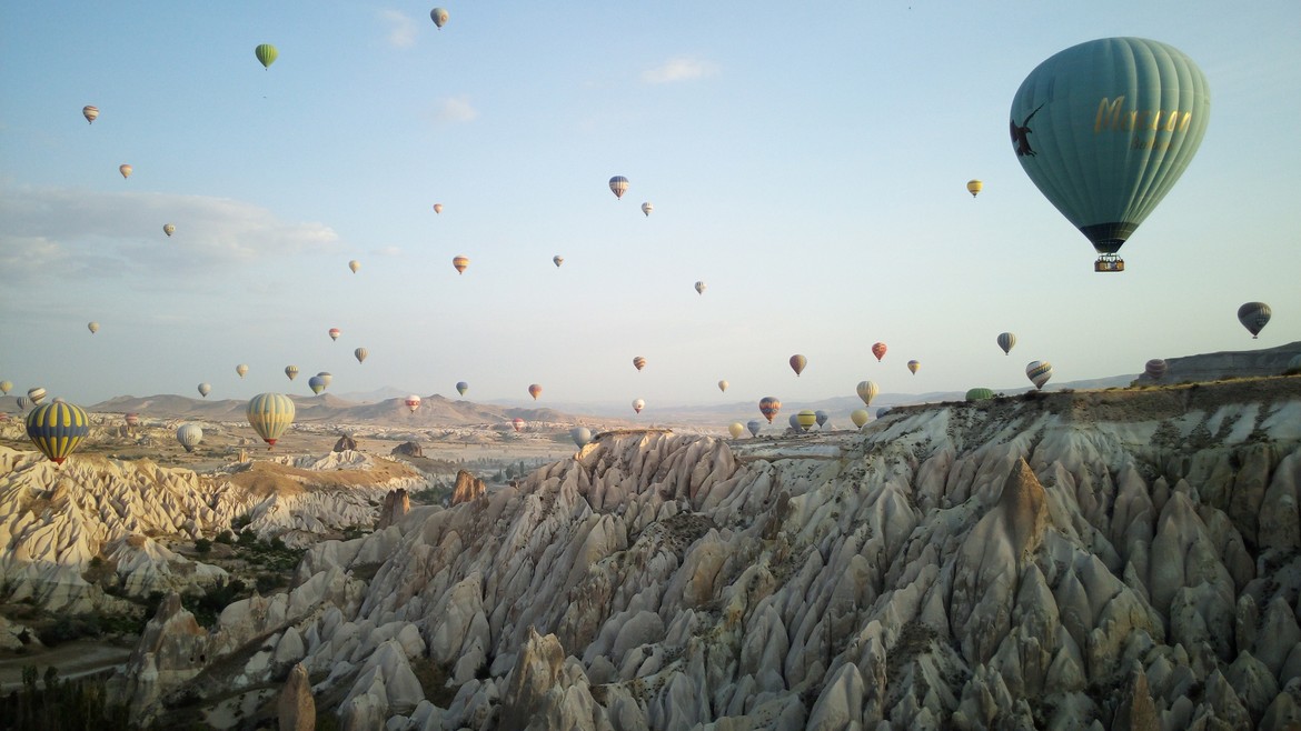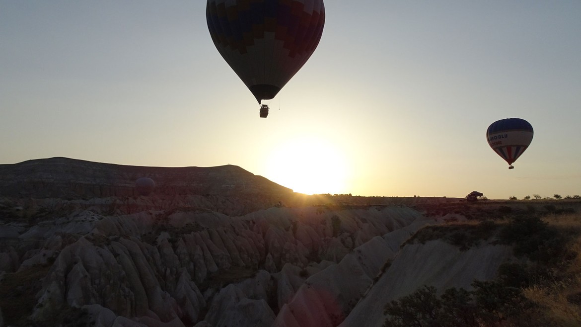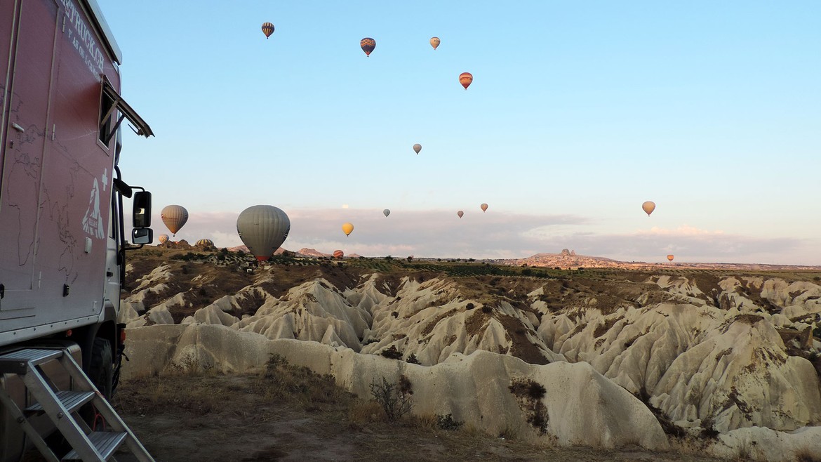 À 5h, le réveil sonne. Il est un spectacle à ne pas manquer : celui du décollage des ballons. Ce sont près d'une centaine de montgolfières qui vont, une heure durant, envahir le ciel de Cappadoce. Il y en a tellement et partout qu'il nous est difficile de les photographier. Notre "terrasse" nous offre probablement le meilleur point de vue sur ce ballet envoûtant au lever du jour. Notre spot idéal nous fait même renoncer à prendre part au vol lui-même. Il faut tout de même compter près de 150€ pour voir le lever du soleil de la nacelle.