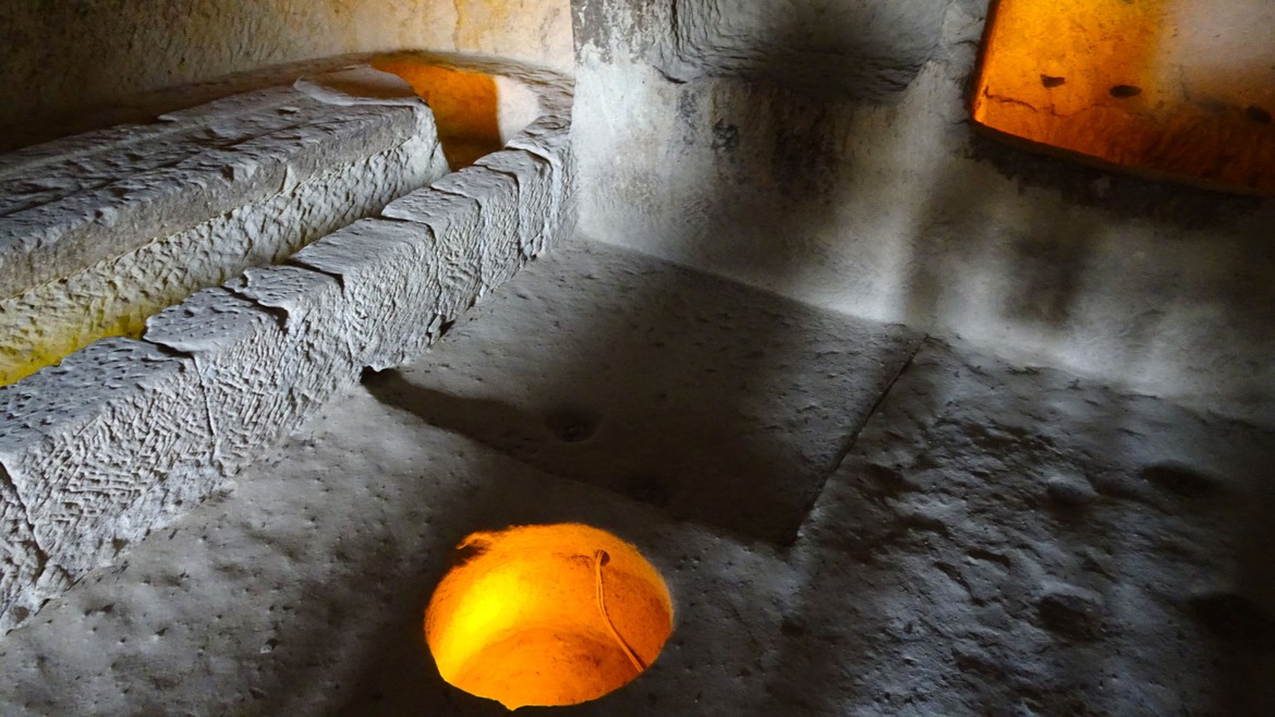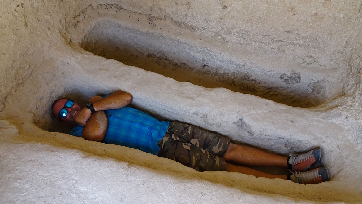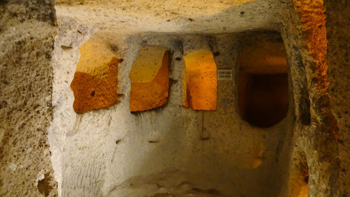 En fin de journée, nous quittons les paysages de Cappadoce pour la ville de Kaymakli où se trouve une des plus grosses cités souterraines de la Turquie, la seconde en taille après Derinkuyu. Elle pouvait accueillir environ 5'000 personnes qui y trouvaient refuge en temps de guerre, notamment les Paléochrétiens qui fuyaient l'oppression. Chaque famille avait une chambre plus ou moins grande, dotée de pièces secondaires pour les familles les plus riches. On y trouvait aussi des pièces communes, des chapelles et des secteurs réservés à l'inhumation des morts que l'on momifiait pour des questions de santé publique. Le tout est relié par une série de couloirs qu'on pouvait barricader à l'aide de pierres qu'on roulait devant les entrées. La population pouvait y vivre jusqu’à six mois, les assaillants évitant la rudesse de l’hiver dans la région.
