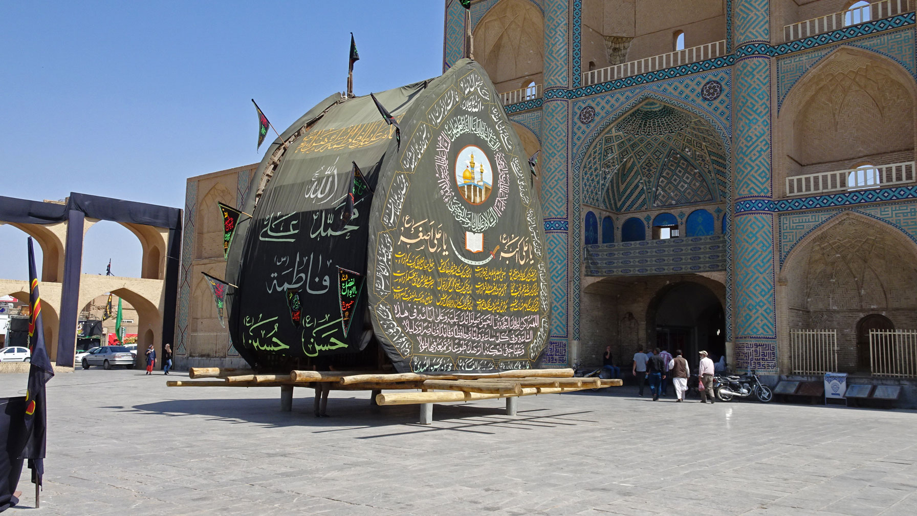 En ce temps de Muharram, nous accordons une parenthèse spéciale au Complexe Amir Chaghmagh qui regroupe une mosquée, un bazar, un caravansérail ainsi qu’un tekiyeh. C’est sur cette place qu’aura lieu dans trois jours la commémoration du martyr de l'Imam Hussain (voir Ispahan et Désert de Varzaneh , Muharram et Ashura, c’est quoi ?) Chaque région a un élément de commémoration qui lui est propre. Pour Yazd, il s’agit du Nakhl, une énorme structure en bois, symbolisant le sarcophage de l’Imam Hussain et de ses hommes, recouverte de tissu noir sur lesquels sont suspendus dagues et épées. Le jour de la commémoration, ce sont des centaines de personnes endeuillées qui le portent.