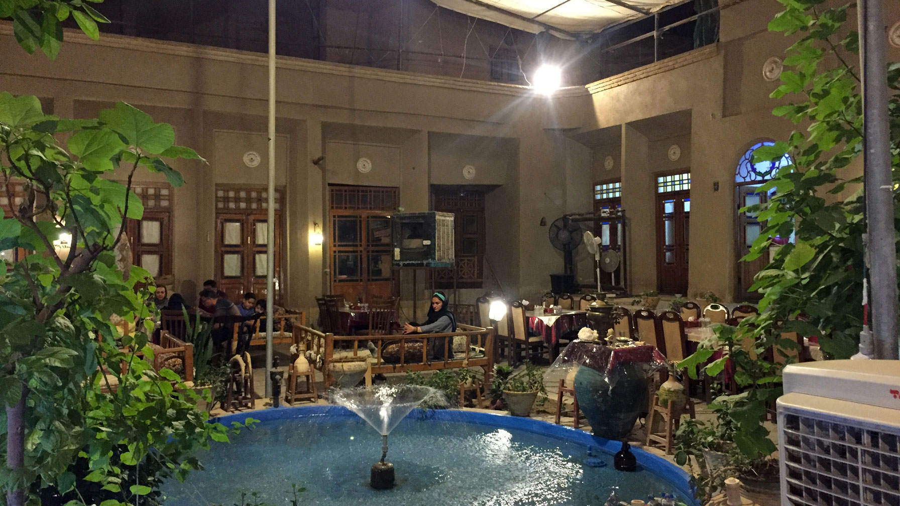 Les ruelles de Yazd présentent pour la plupart des façades borgnes sur rue. Mais lorsqu’on a la chance de pousser une porte alors s’ouvrent devant nous de généreuses cours intérieures, avec fontaines et plantation, comme une mini oasis au sein de chaque ménage. Il en va de même pour l’hôtel. Et avec la chaleur suffocante extérieure (près de 40 degrés), nous sommes heureux de trouver un minimum de fraîcheur dans cet espace fort accueillant et sympathique, à un tel point que nous décidons d’y passer la journée.
