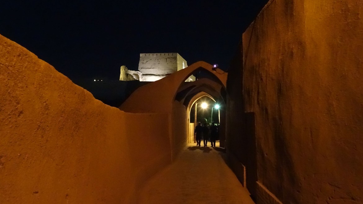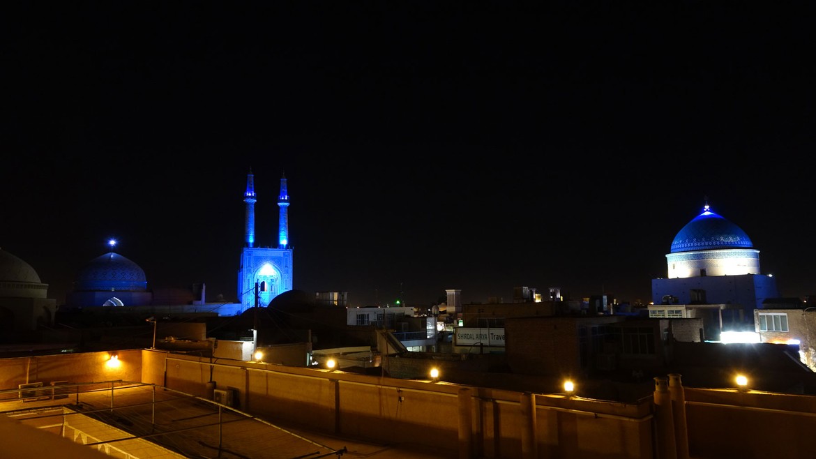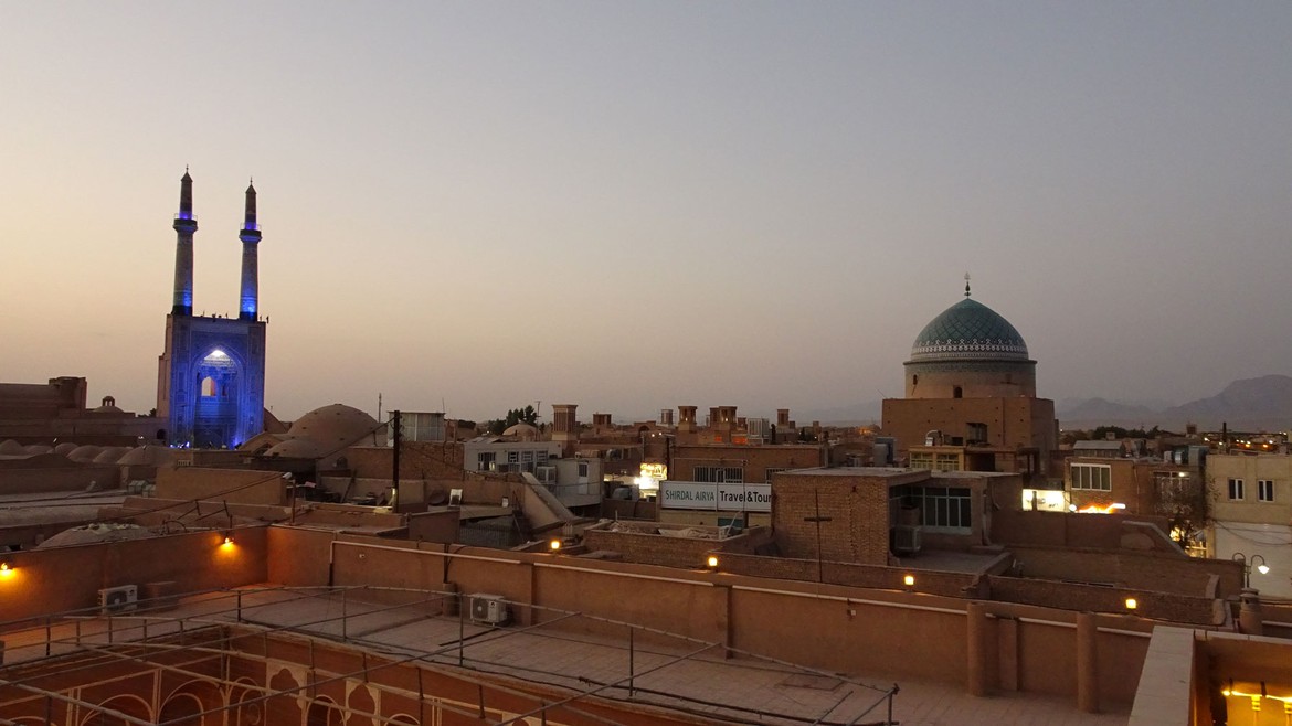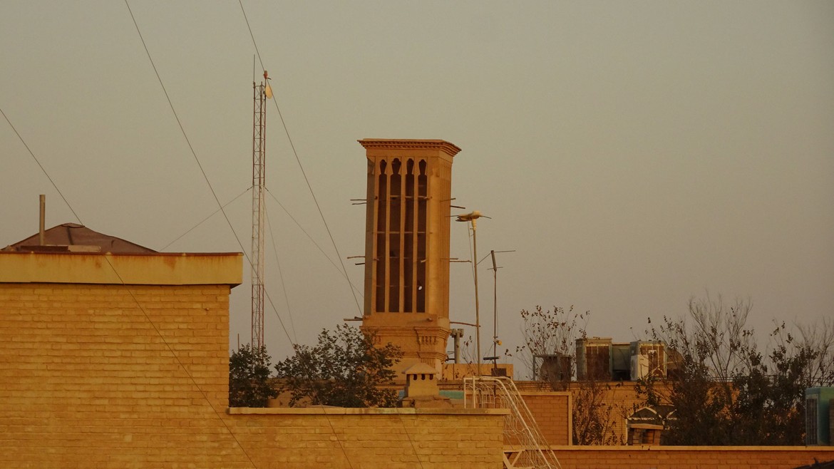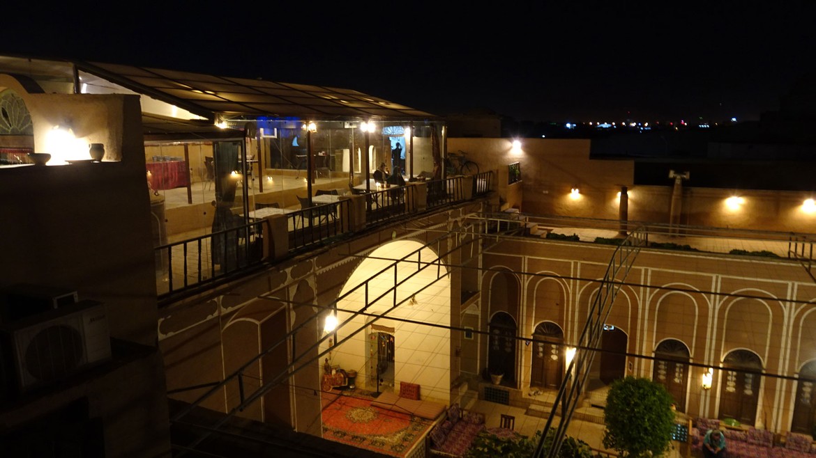 Nous nous émerveillons aussi devant les bâdgir ou tours à vent, dont Yazd en est la ville par excellence. Il s’agit d’un système ingénieux utilisé pour créer une ventilation naturelle et rafraîchissante des locaux à vivre sous forme de tour en briques, ou en mélange de terre d’argile, de terre et d’eau, disposées au-dessus des toits. Nous en avions déjà vu quelques exemples dans les maisons historiques de Kashan (voir Désert de Maranjab et Kashan ) mais ce n’est qu’une pâle copie de ce qui s’offre à nos yeux ici à Yazd. La plupart des bâtiments en sont équipés. J’invite les curieux à découvrir l’origine et le fonctionnement plus exhaustif de cette architecture adaptée à un milieu extrême ici . Nous remercions notre homme et sa famille pour leur accueil impromptue et terminons notre soirée au Marco Polo Rooftop Restaurant de l’Orient Traditional Hotel.