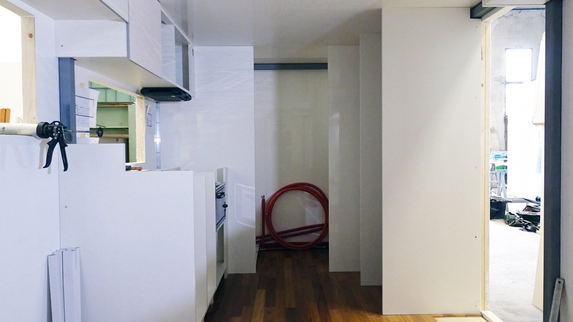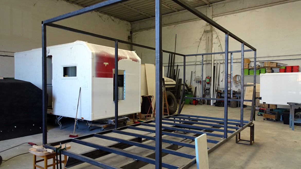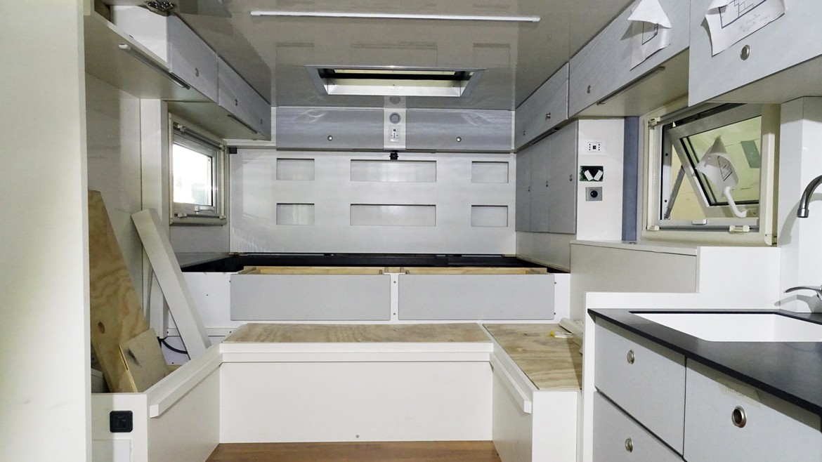 La pièce à vivre contient de nombreux rangements en tout genre. Aucun espace n’est perdu. Sous le lit se trouve le garage, accessible depuis l’extérieur, avec les pièces de rechange, l’outillage, les batteries et tout ce à quoi vous pourriez logiquement penser.